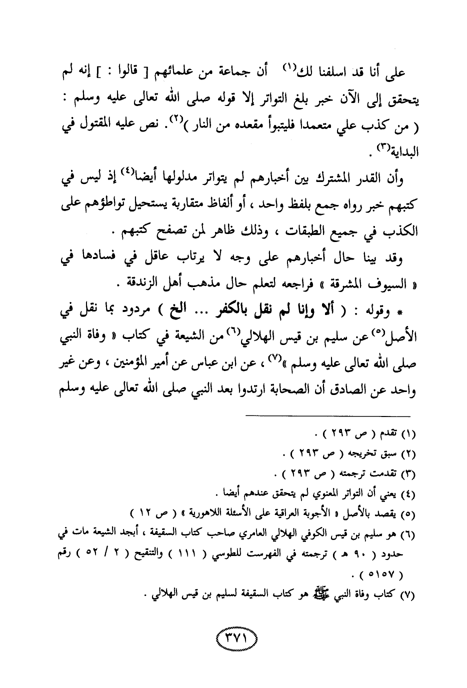 وقوله: (ألا وإنا لم نقل بالكفر.... إلخ) مردود بما نقل في الأصل عن سليم بن قيس الهلالي من الشيعة في كتاب " وفاة النبي صلى الله تعالى عليه وسلم "، عن ابن عباس عن أمير المؤمنين، وعن غير واحد عن الصادق أن الصحابة ارتدوا بعد النبي صلى الله تعالى عليه وسلم