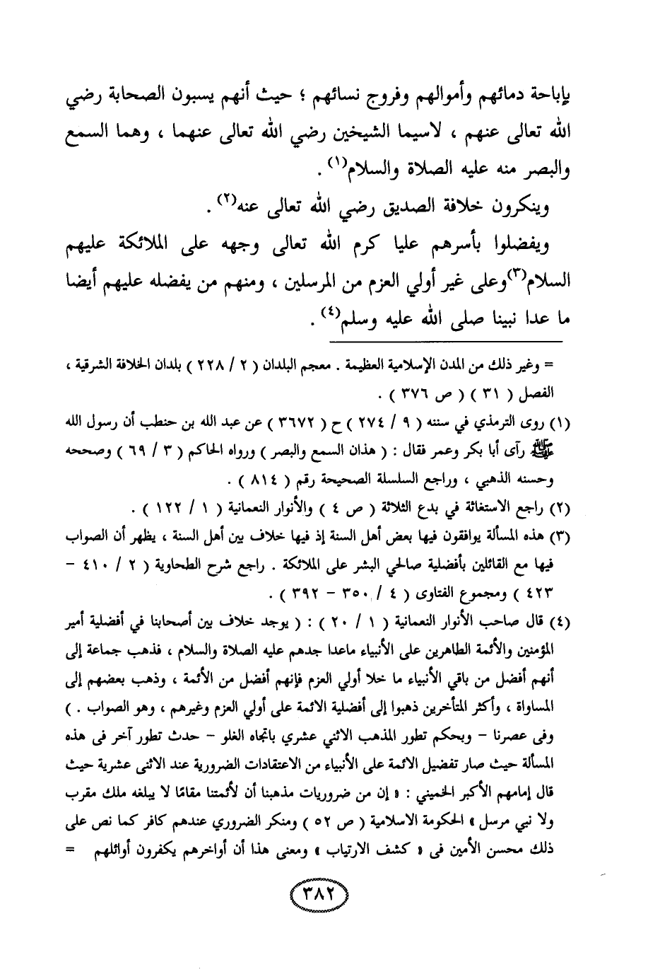 ويفضلوا بأسرهم عليا كرم الله تعالى وجهه على الملائكة عليهم السلام وعلى غير أولي العزم من المرسلين، ومنهم من يفضله عليهم أيضا ما عدا نبينا صلى الله عليه وسلم.