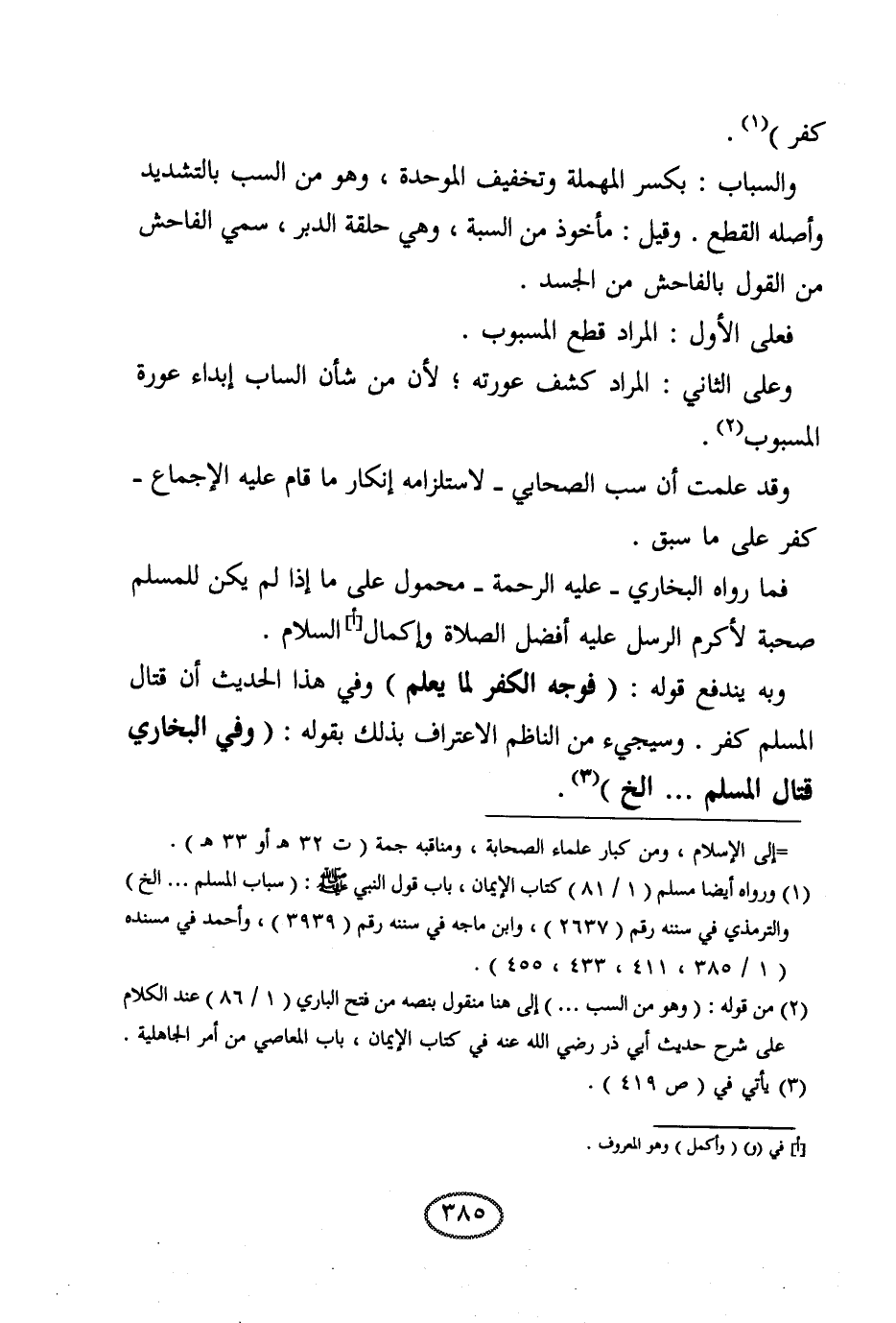 وقد علمت أن سب الصحابي -لاستلزامه إنكار ما قام عليه الإجماع- كفر على ما سبق. فما رواه البخاري عليه الرحمة محمول على ما إذا لم يكن للمسلم صحبة لأكرم الرسل عليه أفضل الصلاة وإكمال السلام.