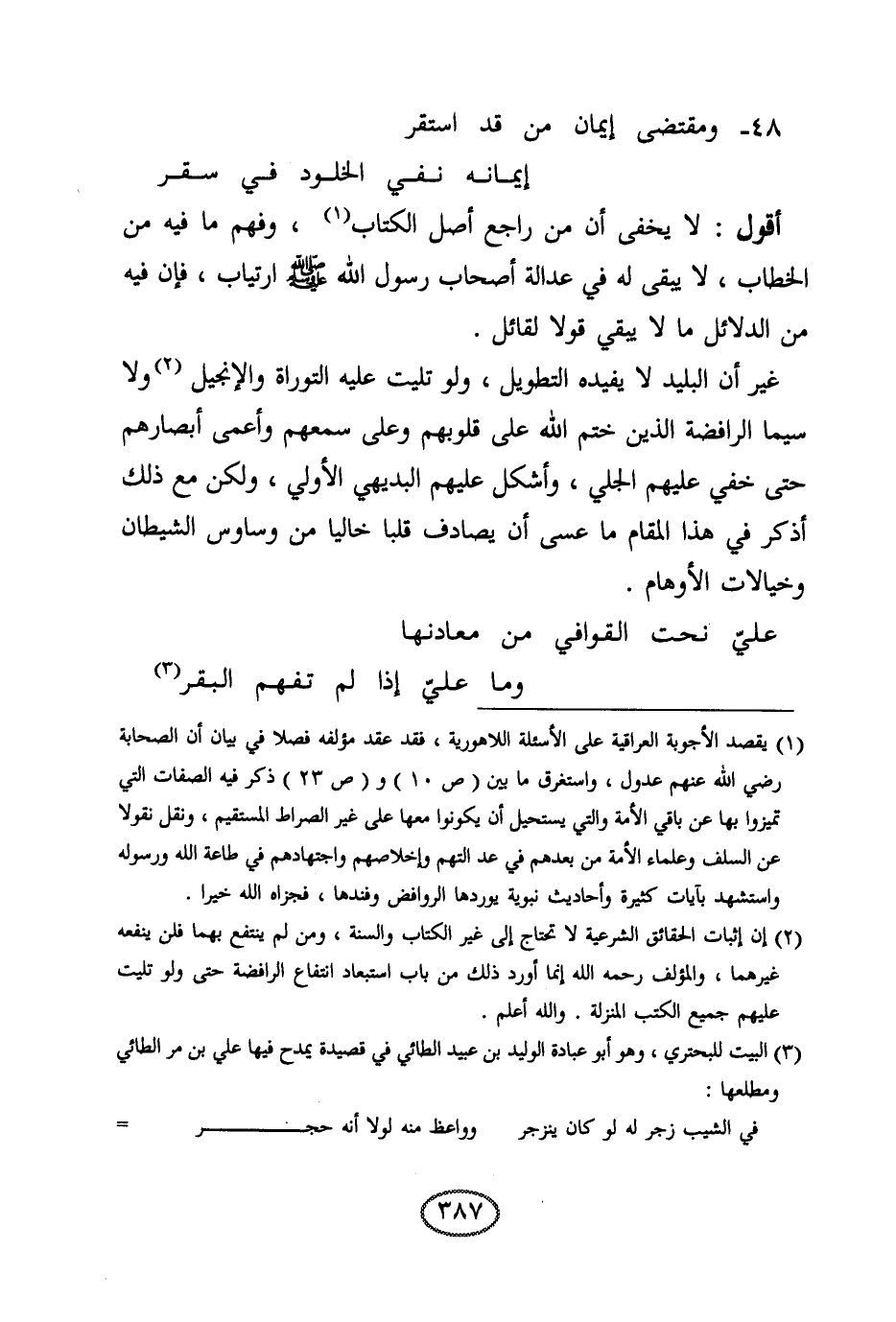 48 - ومقتضى إيمان من قد استقر ... إيمانه نفي الخلود في سقر