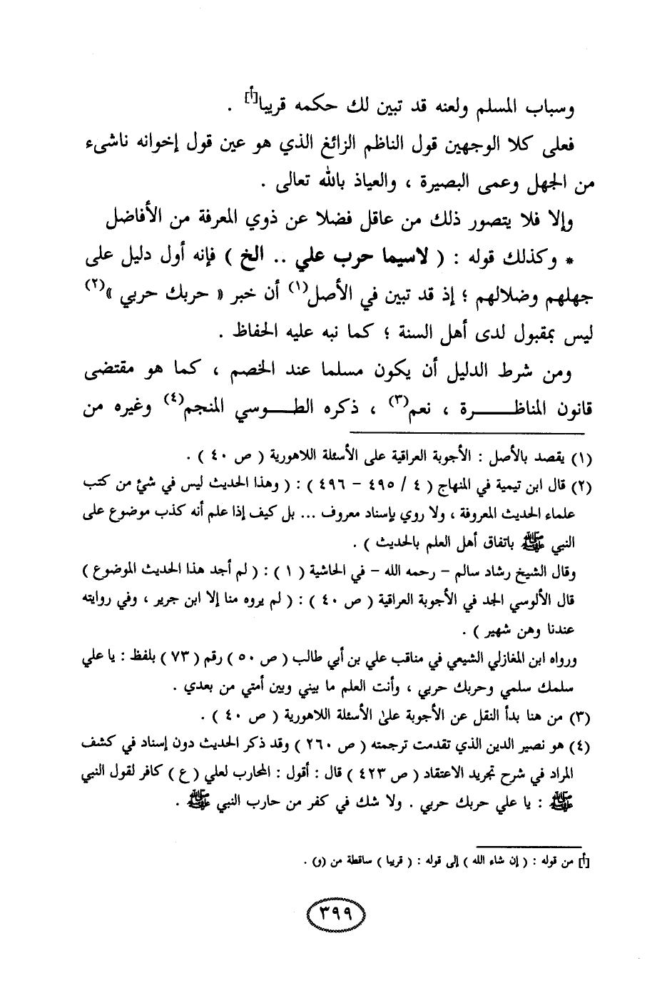* وكذلك قوله: (لا سيما حرب علي ... إلخ) فإنه أول دليل على جهلهم وضلالهم؛ إذ قد تبين في الأصل أن خبر " حربك حربي " ليس بمقبول لذى أهل السنة؛ كما نبه عليه الحفاظ.