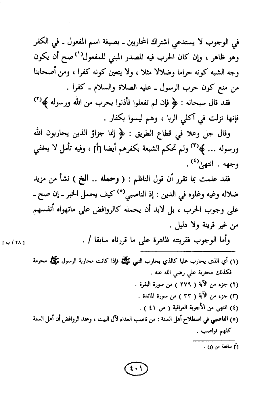 وقال جل وعلا في قطاع الطريق: {إِنَّمَا جَزَاءُ الَّذِينَ يُحَارِبُونَ اللَّهَ وَرَسُولَهُ} ولم تحكم الشيعة بكفرهم أيضا، وفيه تأمل لا يخفى وجهه. انتهى.