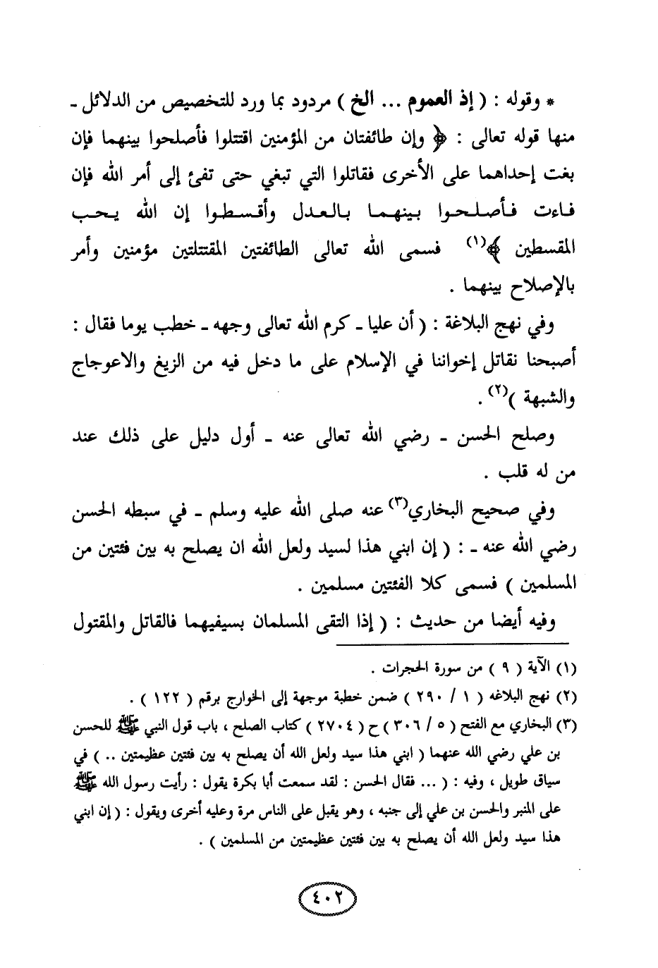 وصلح الحسن رضي الله تعالى عنه أول دليل على ذلك عند من له قلب. وفي صحيح البخاري عنه صلى الله عليه وسلم في سبطه الحسن رضي الله عنه: ( «إن ابني هذا لسيد ولعل الله أن يصلح به بين فئتين من المسلمين» ) فسمى كلا الفئتين مسلمين. وفيه أيضا من حديث: ( «إذا التقى المسلمان بسيفيهما فالقاتل والمقتول