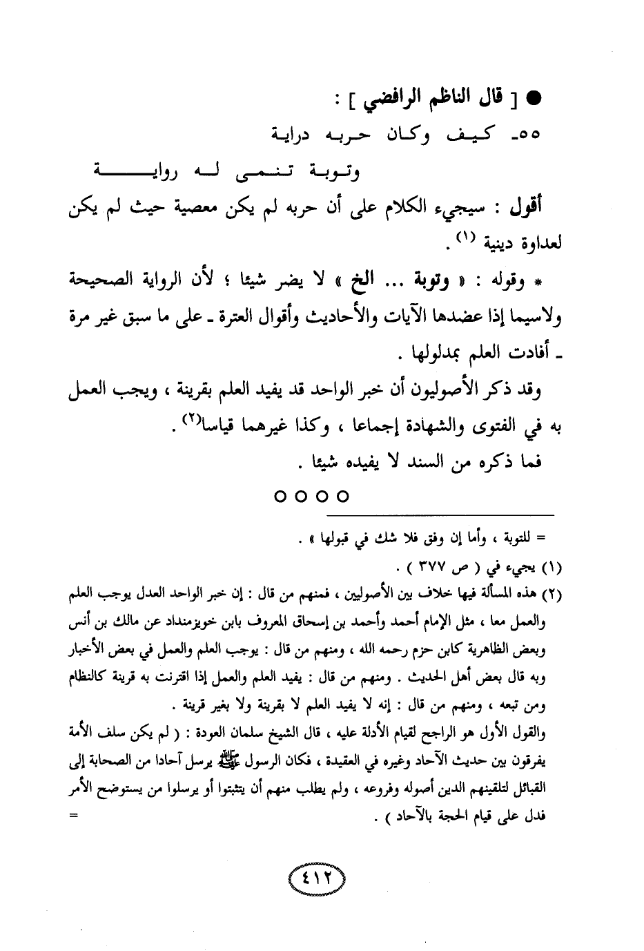 * وقوله: " وتوبة ... إلخ " لا يضر شيئا؛ لأن الرواية الصحيحة ولا سيما إذا عضدها الآيات والأحاديث وأقوال العترة -على ما سبق غير مرة- أفادت العلم بمدلولها.