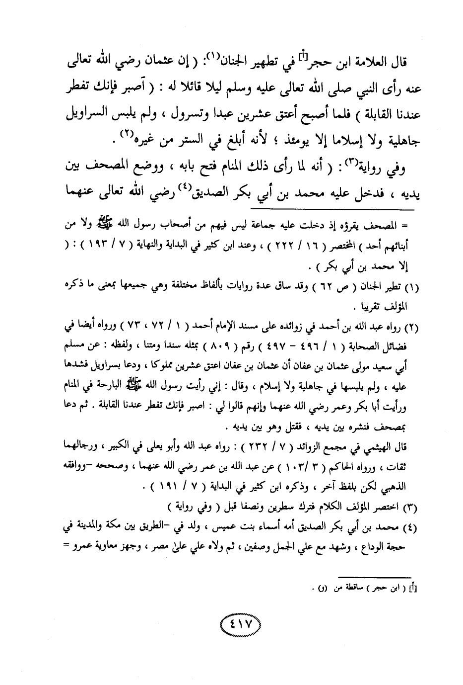 قال العلامة ابن حجر في تطهير الجنان: (إن عثمان رضي الله تعالى عنه رأى النبي صلى الله تعالى عليه وسلم ليلا قائلا له: ( «اصبر فإنك تفطر عندنا القابلة» ) فلما أصبح أعتق عشرين عبدا وتسرول، ولم يلبس السراويل جاهلية ولا إسلاما إلا يومئذ؛ لأنه أبلغ في الستر من غيره.