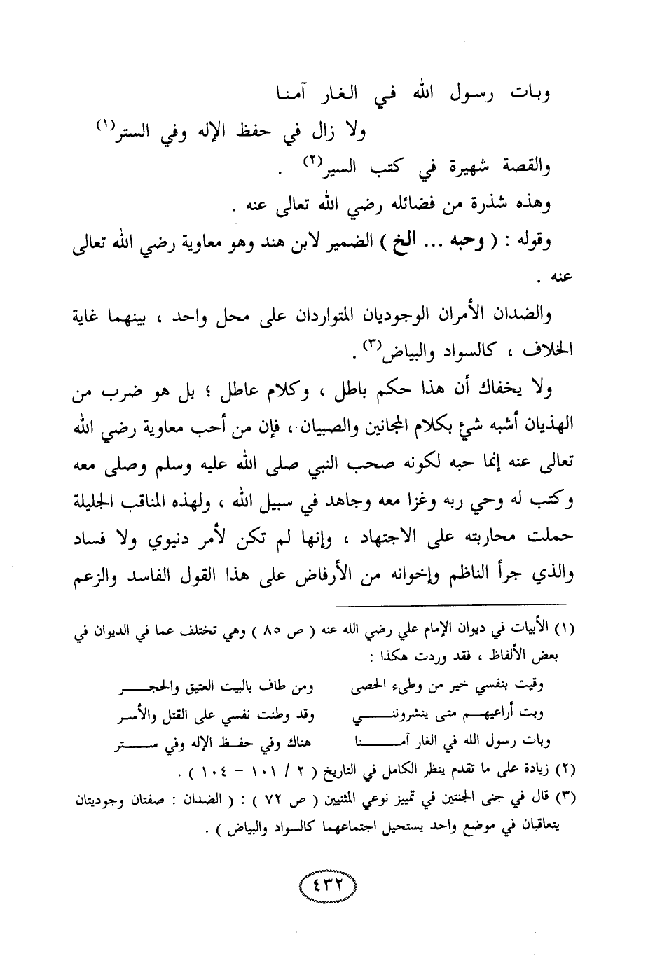 ولا يخفاك أن هذا حكم باطل، وكلام عاطل؛ بل هو ضرب من الهذيان أشبه شيء بكلام المجانين والصبيان، فإن من أحب معاوية رضي الله تعالى عنه إنما حبه لكونه صحب النبي صلى الله عليه وسلم وصلى معه وكتب له وحي ربه وغزا معه وجاهد في سبيل الله، ولهذه المناقب الجليلة حملت محاربته على الاجتهاد، وإنها لم تكن لأمر دنيوي ولا فساد، والذي جرأ الناظم وإخوانه من الأرفاض على هذا القول الفاسد والزعم