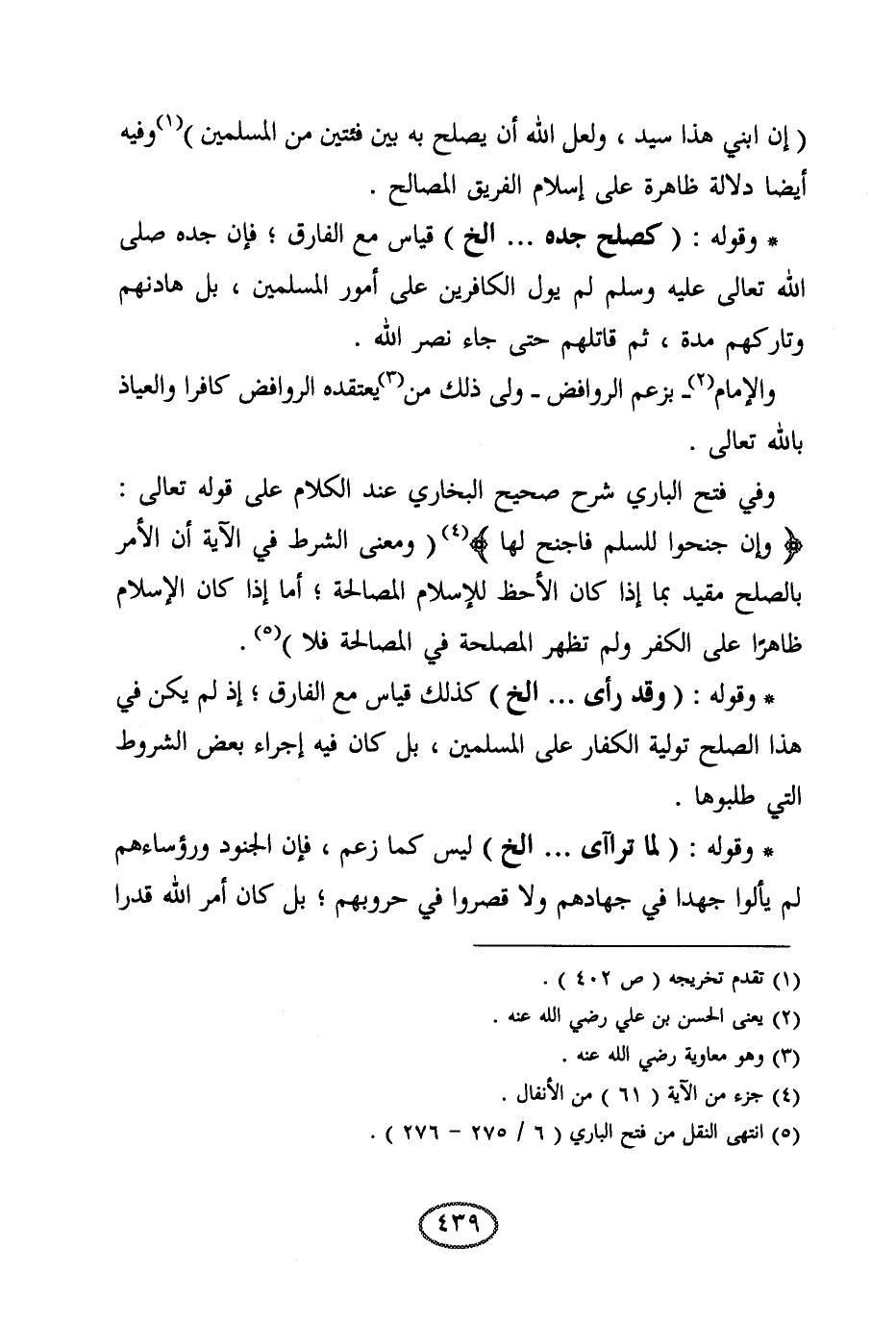 ( «إن ابني هذا سيد، ولعل الله أن يصلح به بين فئتين من المسلمين» ) وفيه أيضا دلالة ظاهرة على إسلام الفريق المصالح.