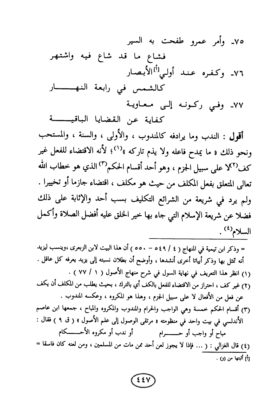 أقول: الندب وما يرادفه كالمندوب، والأولى، والسنة، والمستحب، ونحو ذلك " ما يمدح فاعله ولا يذم تاركه "؛ لأنه الاقتضاء للفعل غير كف لا على سبيل الجزم، وهو أحد أقسام الحكم الذي هو خطاب الله تعالى المتعلق بفعل المكلف من حيث هو مكلف، اقتضاء جازما أو تخييرا. ولم يرد في شريعة من الشرئع التكليف بسب أحد والإثابة على ذلك فضلا عن شريعة الإسلام التي جاء بها خير الخلق عليه أفضل الصلاة وأكمل السلام.