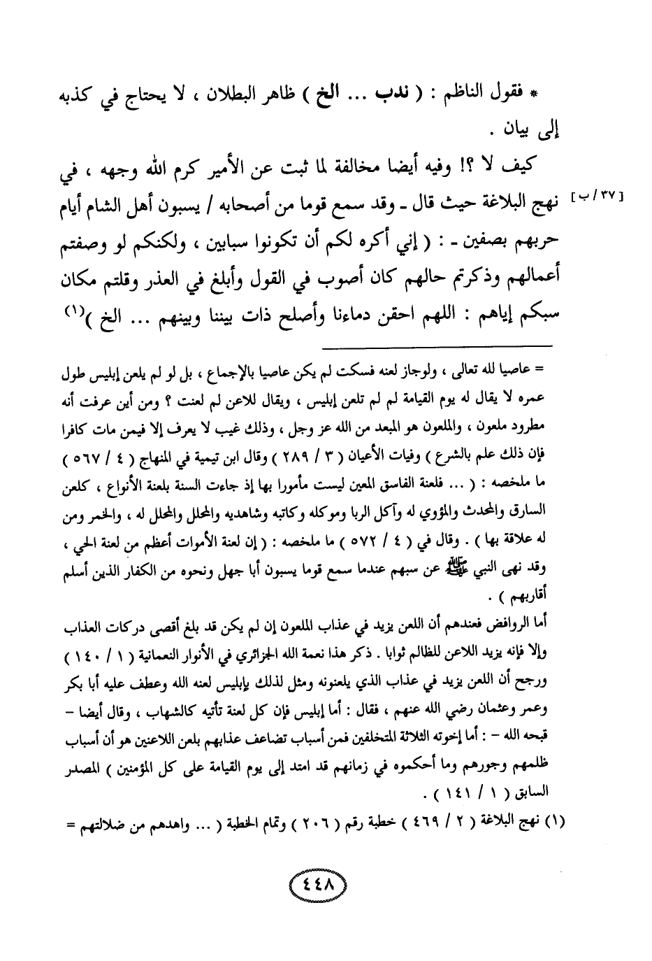 كيف لا؟ ! وفيه أيضا مخالفة لما ثبت عن الأمير كرم الله وحهه، في نهج البلاغة حيث قال، وقد سمع قوما من أصحابه يسبون أهل الشام أيام حربهم بصفين: (إني أكره لكم أن تكونوا سبابين، ولكنكم لو وصفتم أعمالهم وذكرتم حالهم كان أصوب في القول وأبلغ في العذر وقلتم مكان سبكم إياهم: اللهم احقن دماءنا وأصلح ذات بيننا وبينهم ... إلخ) .