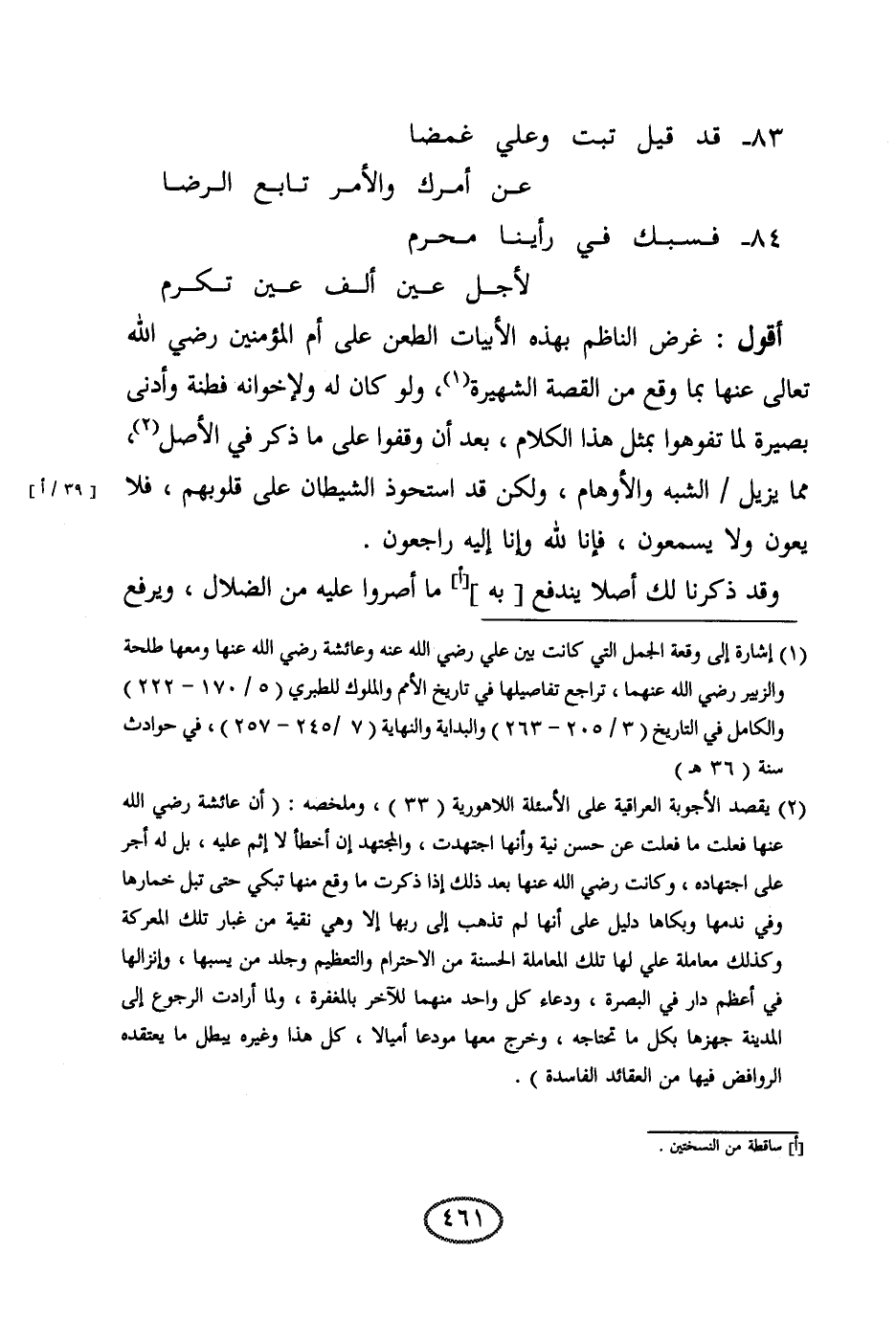 أقول: غرض الناظم بهذه الأبيات الطعن على أم المؤمنين رضي الله تعالى عنها بما وقع في القصة الشهيرة، ولو كان له ولإخوانه فطنة وأدنى