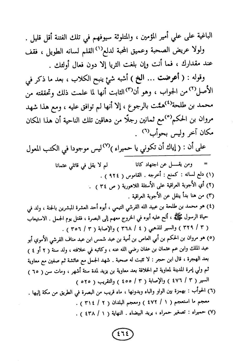 وقوله: (أعرضت ... إلخ) أشبه شيء بنبح الكلاب، بعد ما ذكر في الأصل من الجواب، وهو أن الثابت أنها لما علمت ذلك وتحققته من محمد بن طلحة همت بالرجوع، إلا أنها لم توافق عليه، ومع هذا شهد مروان بن الحكم مع ثمانين رجلاً من دهاقين تلك الناحية أن هذا المكان