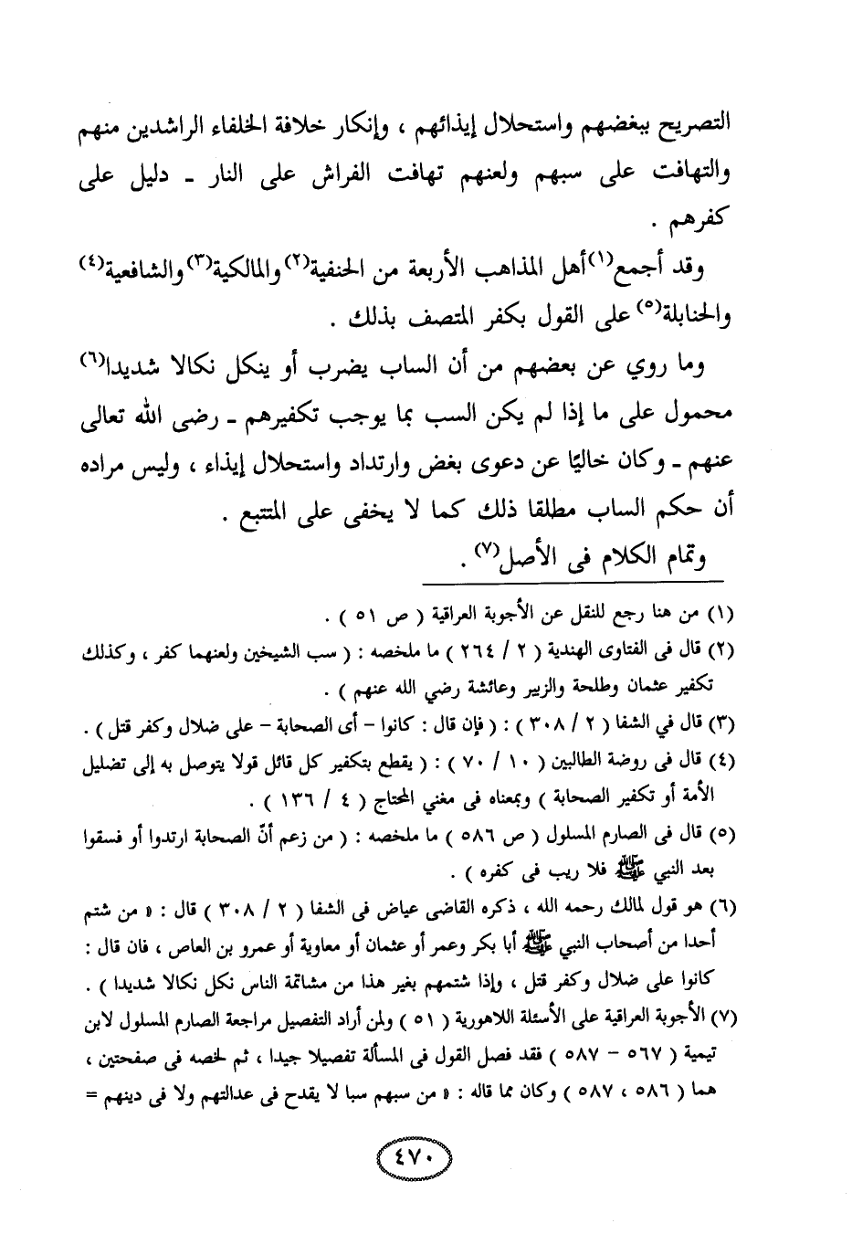 وما روي عن بعضهم من أن الساب يضرب أو ينكل نكالا شديدا، محمول على ما إذا لم يكن السب بما يوجب تكفيرهم -رضى الله تعالى عنهم- وكان خاليا عن دعوى بغض وارتداد واستحلال إيذاء، وليس مراده أن حكم الساب مطلقا ذلك، كما لا يخفى على المتتبع.