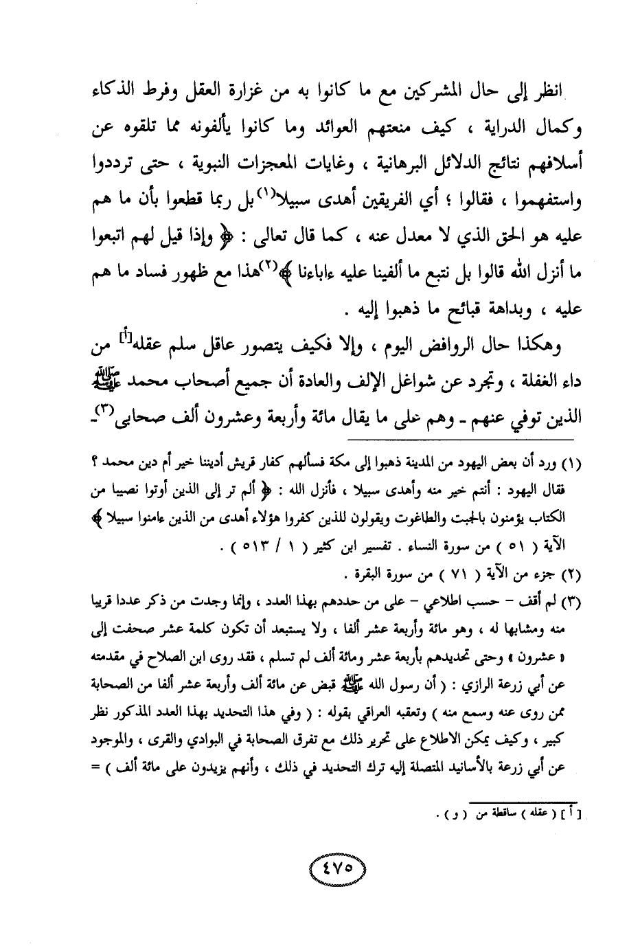 انظر إلى حال المشركين مع ما كانوا به من غزارة العقل وفرط الذكاء وكمال الدراية، كيف منعتهم العوائد وما كانوا يألفونه مما تلقوه عن أسلافهم نتائج الدلائل البرهانية، وغايات المعجزات النبوية، حتى ترددوا واستفهموا، فقالوا: أي الفريقين أهدى سبيلا؟ بل ربما قطعوا بأن ما هم عليه هو الحق الذي لا معدل عنه، كما قال تعالى: {وَإِذَا قِيلَ لَهُمُ اتَّبِعُوا مَا أَنْزَلَ اللَّهُ قَالُوا بَلْ نَتَّبِعُ مَا أَلْفَيْنَا عَلَيْهِ آبَاءَنَا} هذا مع ظهور فساد ما هم عليه، وبداهة قبائح ما ذهبوا إليه. وهكذا حال الروافض اليوم، وإلا فكيف يتصور عاقل سلم عقله من داء الغفلة، وتجرد عن شواغل الإلف والعادة أن جميع أصحاب محمد صلى الله عليه وسلم الذين توفي عنهم وهم على ما يقال مائة وأربعة وعشرون ألف صحابي