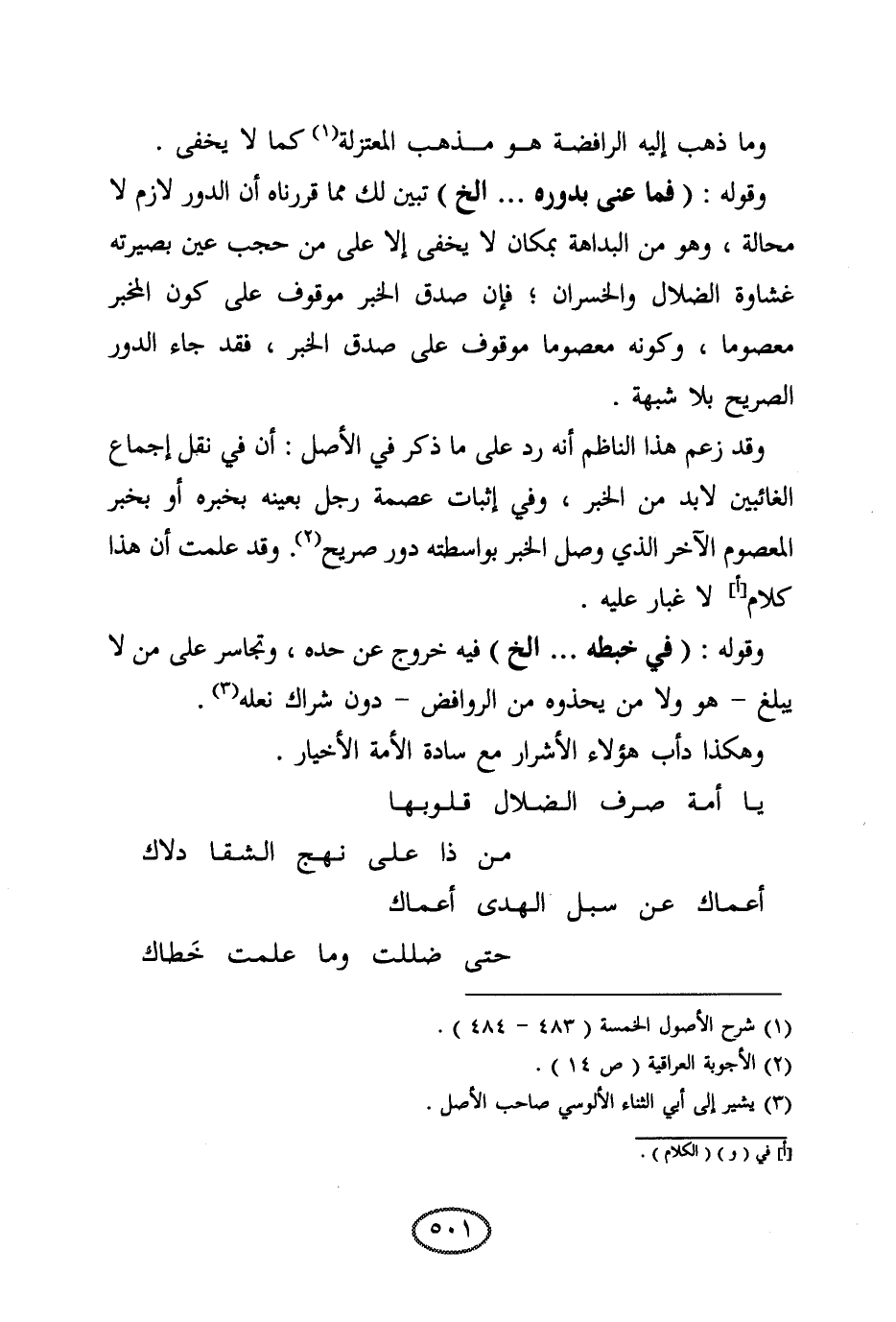 وقوله: (فما عنى بدوره ... إلخ) تبين لك مما قررناه أن الدور لازم لا محالة، وهو من البداهة بمكان لا يخفى إلا على من حجب عين بصيرته غشاوة الضلال والخسران؛ فإن صدق الخبر موقوف على كون المخبر معصوما، وكونه معصوما موقوف على صدق الخبر، فقد جاء الدور الصريح بلا شبهة. وقد زعم هذا الناظم أنه رد على ما ذكر في الأصل: أن في نقل إجماع الغائبين لا بد من الخبر، وفي إثبات عصمة رجل بعينه بخبره أو بخبر المعصوم الآخر الذي وصل الخبر بواسطته دور صريح. وقد علمت أن هذا كلام لا غبار عليه.