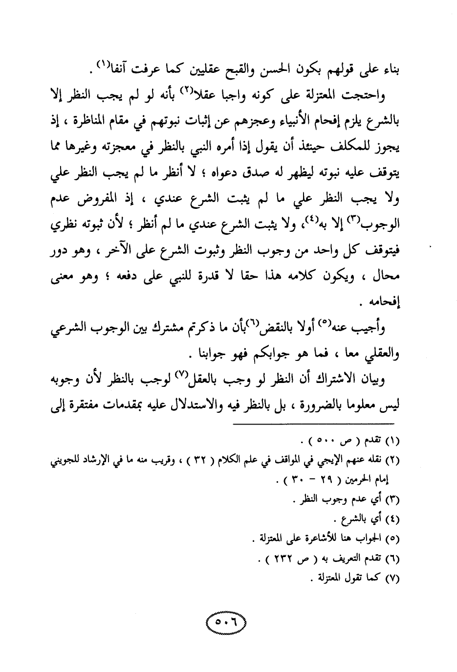 وأجيب عنه أولا بالنقض بأن ما ذكرتم مشترك بين الوجوب الشرعي والعقلي معا، فما هو جوابكم فهو جوابنا. وبيان الاشتراك أن النظر لو وجب بالعقل لوجب بالنظر لأن وجوبه ليس معلوما بالضرورة، بل بالنظر فيه والاستدلال عليه بمقدمات مفتقرة إلى