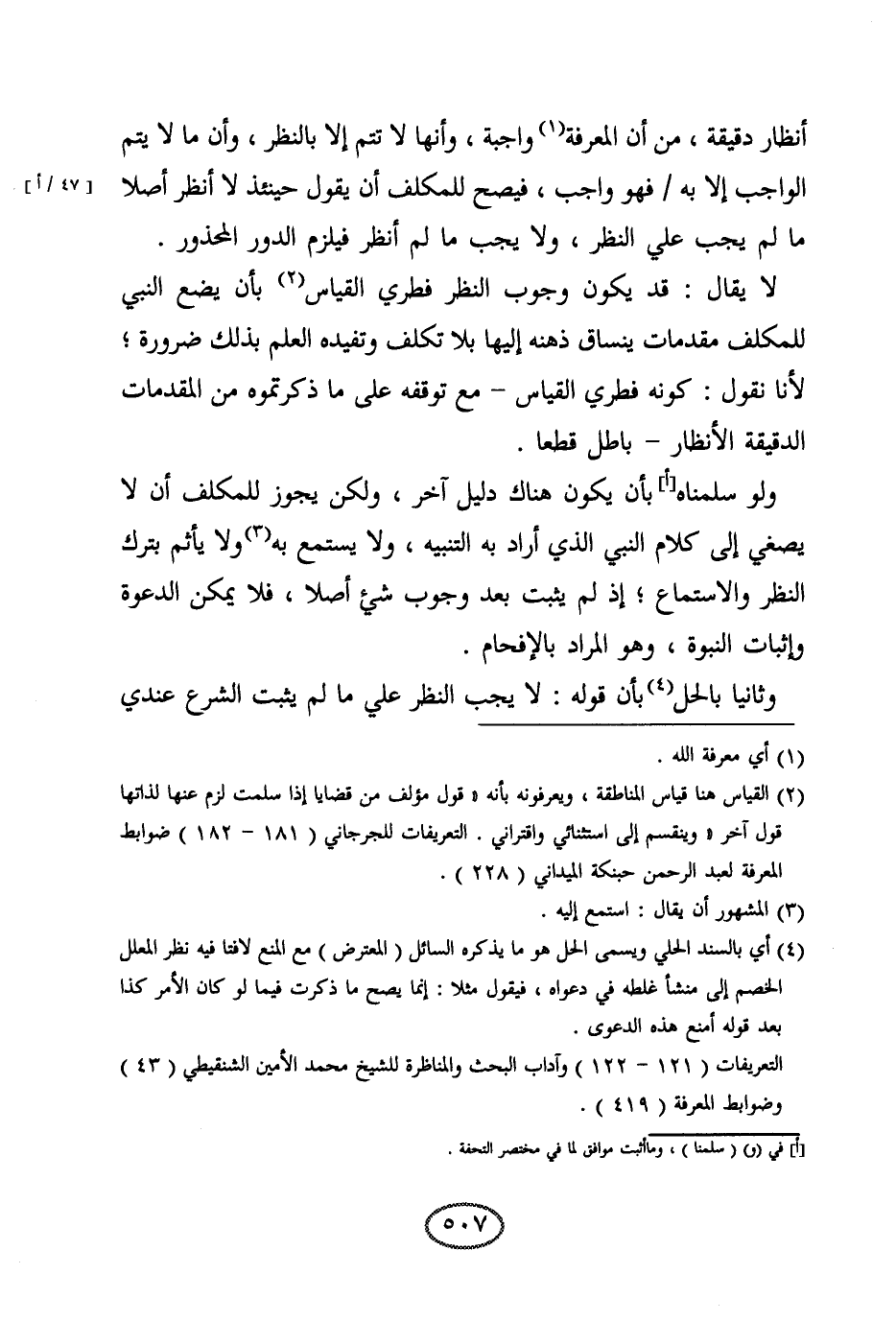 أنظار دقيقة، من أن المعرفة واجبة، وأنها لا تتم إلا بالنظر، وأن ما لا يتم الواجب إلا به فهو واجب، فيصح للمكلف أن يقول حينئذ: لا أنظر أصلا ما لم يجب علي النظر، ولا يجب ما لم أنظر، فيلزم الدور المحذور.