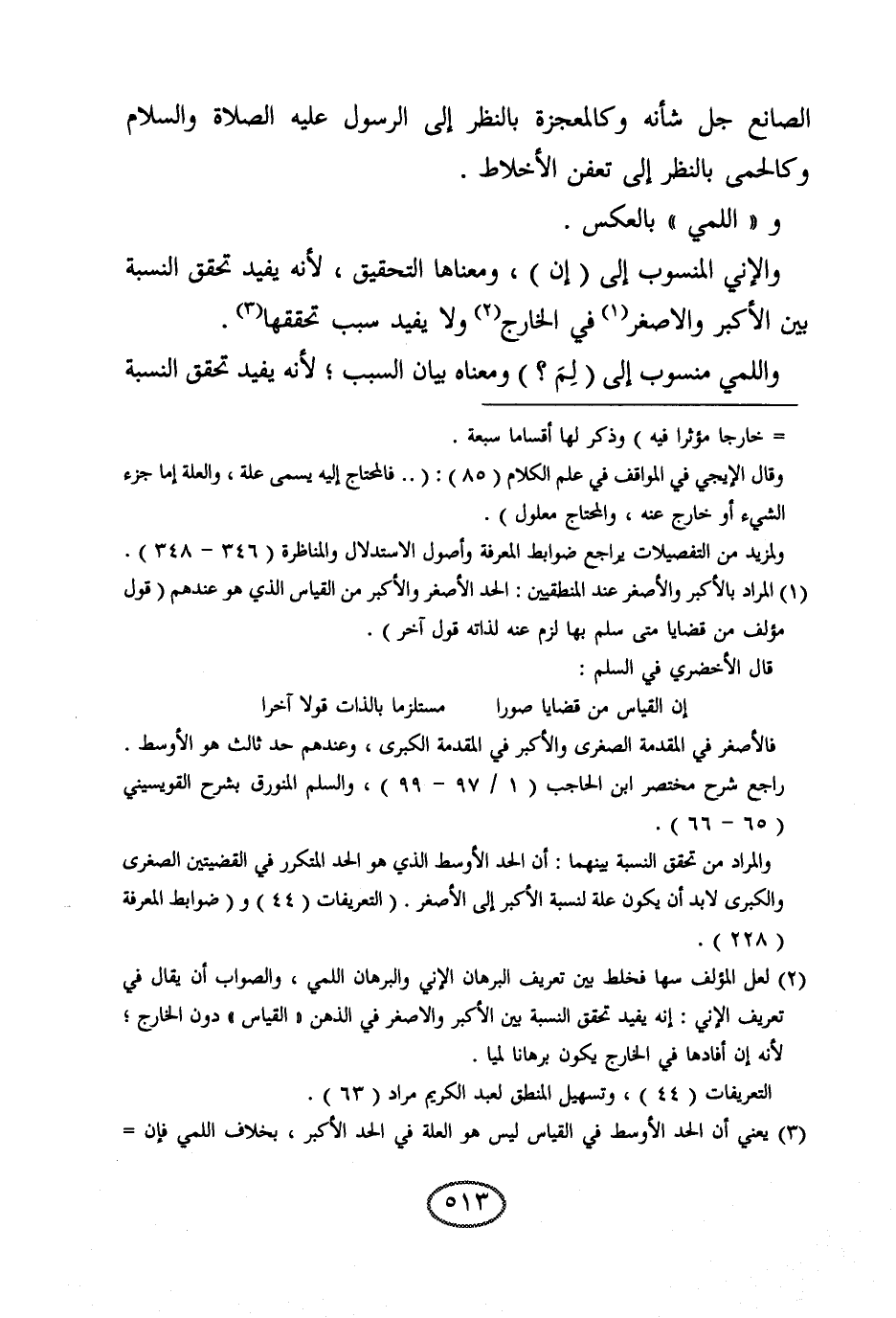 و" اللمي " بالعكس. والإني المنسوب إلى (إن) ، ومعناها التحقيق، لأنه يفيد تحقق النسبة بين الأكبر والأصغر في