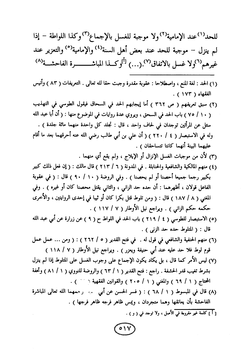 للحد عند الإمامية، ولا موجبة للغسل بالإجماع، وكذا اللواطة إذا لم ينزل موجبة للحد عند بعض أهل السنة والإمامية، والتعزير عند غيرهم، ولا غسل بالاتفاق. ( ... ) وكذا المباشرة الفاحشة
