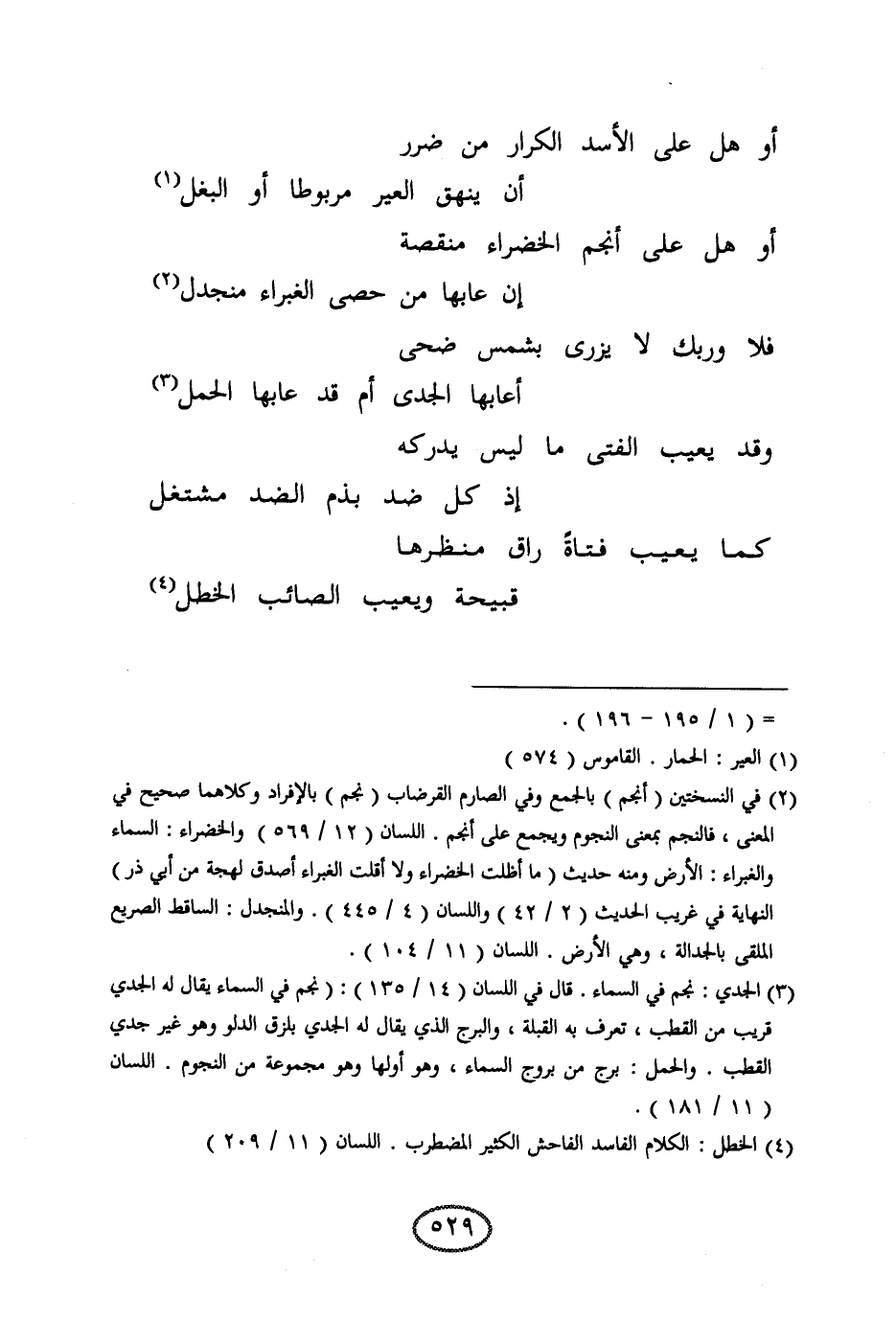 أو هل على الأسد الكرار من ضرر ... أن ينهق العير مربوطا أو البغل