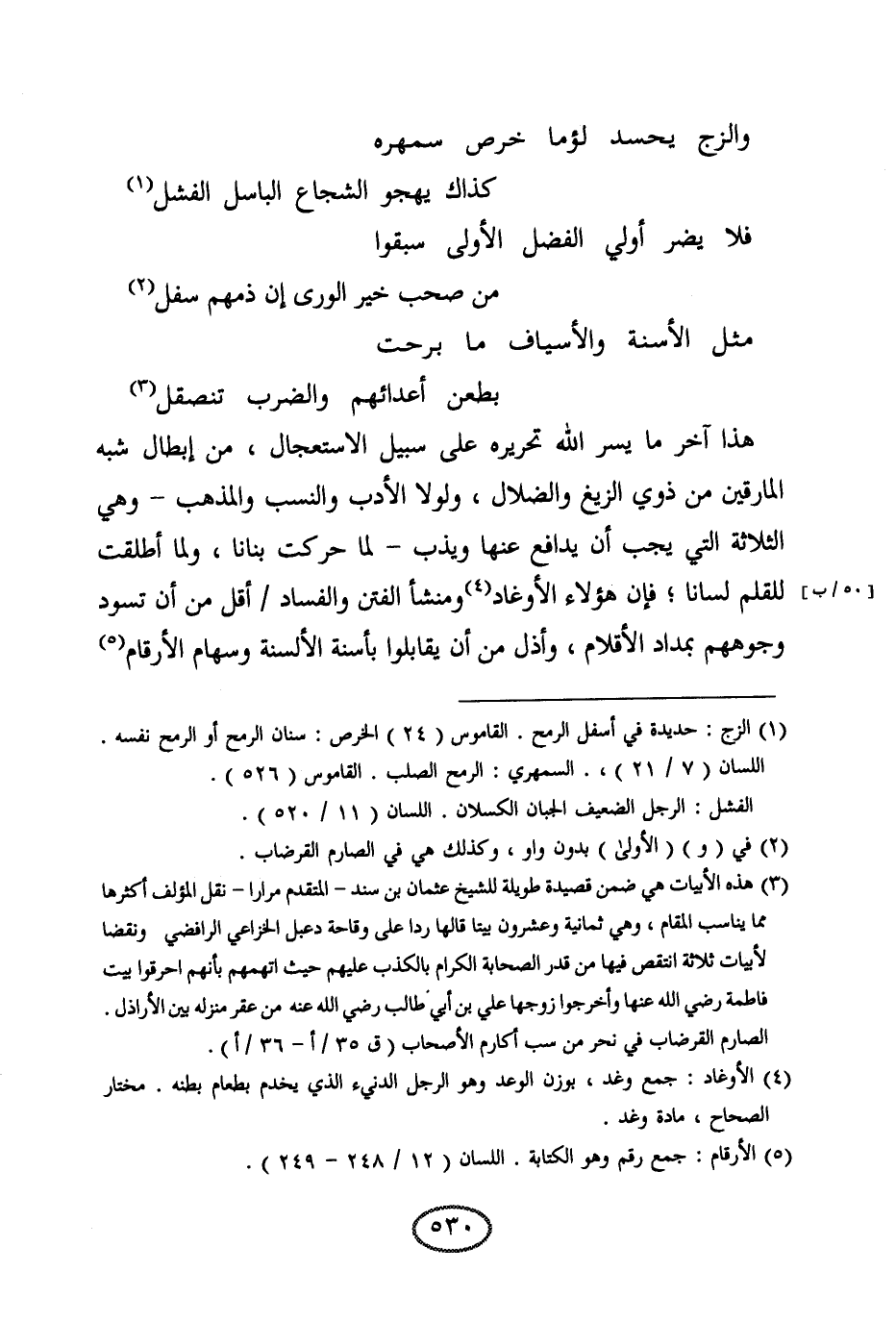 الثلاثة التي يجب أن يدافع عنها ويذب- لما حركت بنانا، ولما أطلقت للقلم لسانا؛ فإن هؤلاء الأوغاد ومنشأ الفتن والفساد أقل من أن تسود وجوههم بمداد الأقلام، وأذل من أن يقابلوا بأسنة الألسنة وسهام الأرقام؛