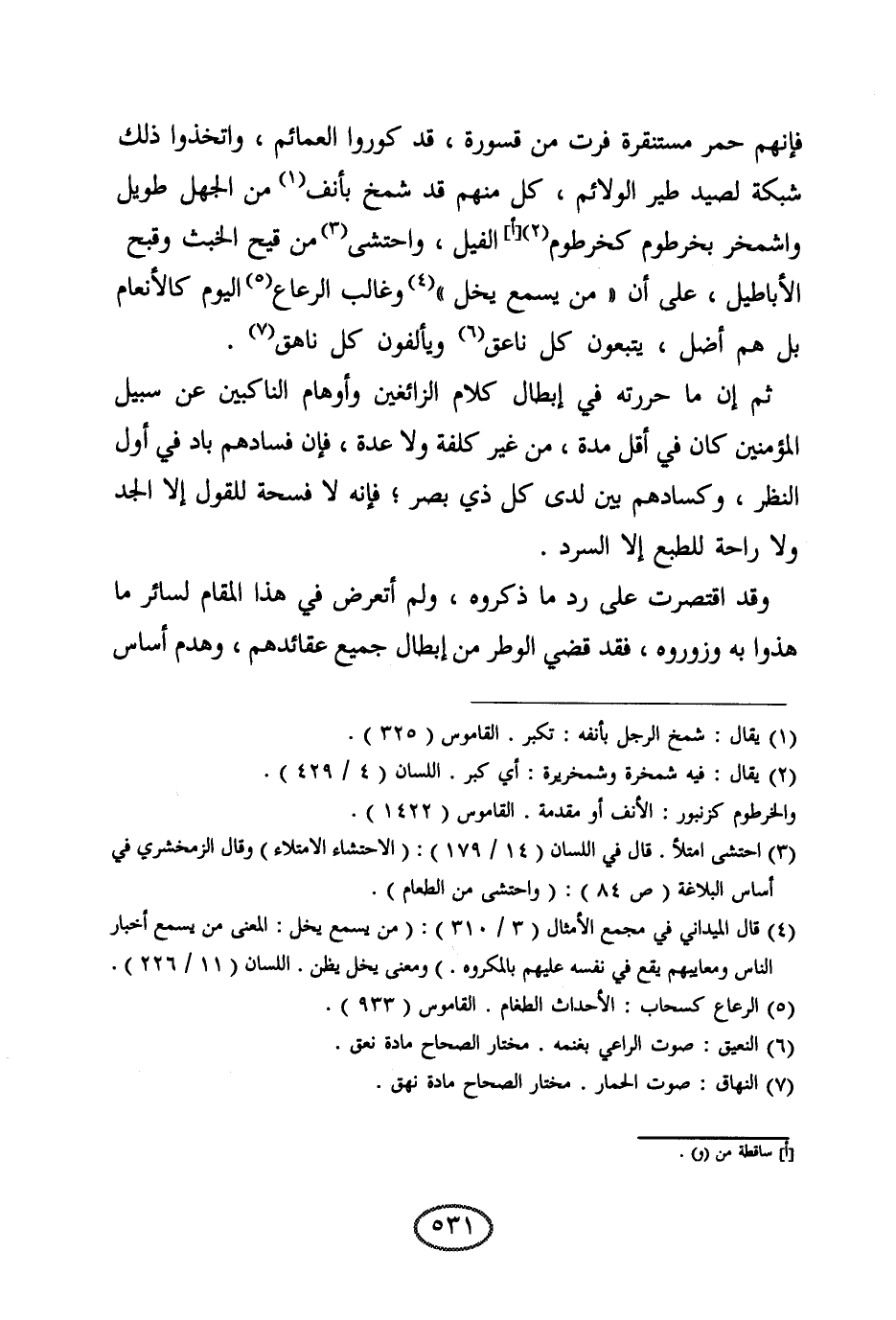 فإنهم حمر مستنفرة فرت من قسورة، قد كوروا العمائم، واتخذوا ذلك شبكة لصيد طير الولائم، كل منهم قد شمخ بأنف من الجهل طويل واشمخر بخرطوم كخرطوم الفيل واحتشى من قبح الخبث وقبح الأباطيل، على أن " من يسمع يخل " وغالب الرعاع اليوم كالأنعام بل هم أضل، يتبعون كل ناعق ويألفون كل ناهق.