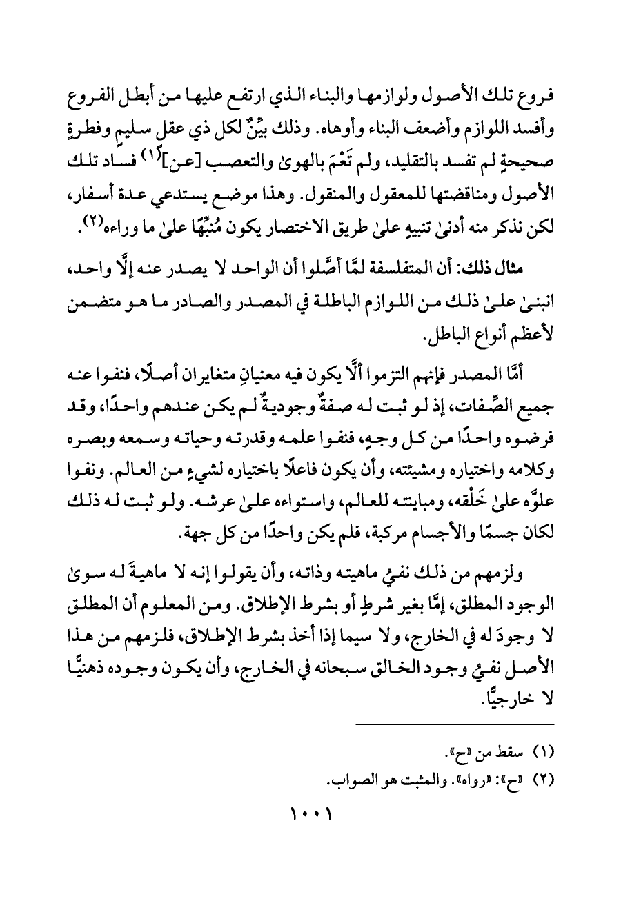 ولزمهم من ذلك نفيُ ماهيته وذاته، وأن يقولوا إنه لا ماهيةَ له سوى الوجود المطلق، إمَّا بغير شرطٍ أو بشرط الإطلاق. ومن المعلوم أن المطلق لا وجودَ له في الخارج، ولا سيما إذا أخذ بشرط الإطلاق، فلزمهم من هذا الأصل نفيُ وجود الخالق سبحانه في الخارج، وأن يكون وجوده ذهنيًّا لا خارجيًّا.