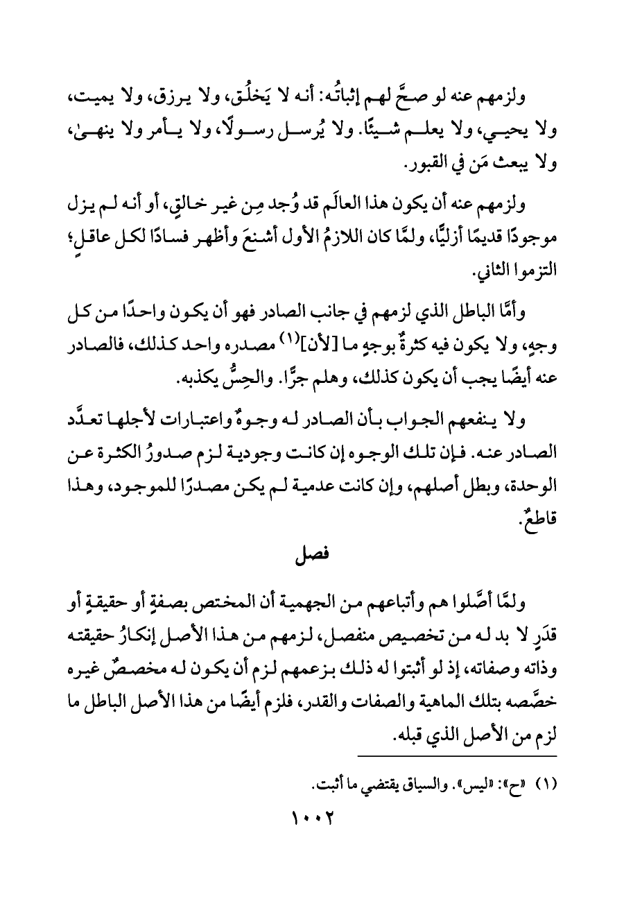 ولا ينفعهم الجواب بأن الصادر له وجوهٌ واعتبارات لأجلها تعدَّد الصادر عنه. فإن تلك الوجوه إن كانت وجودية لزم صدورُ الكثرة عن الوحدة، وبطل أصلهم، وإن كانت عدمية لم يكن مصدرًا للموجود، وهذا قاطعٌ.