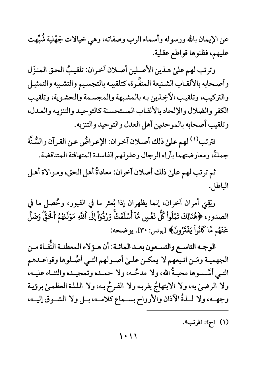 فترتب (¬١) لهم على ذلك أصلان آخران: الإعراضُ عن القرآن والسُّنَّة جملةً، ومعارضتهما بآراء الرجال وعقولهم الفاسدة المتهافتة المتناقضة.