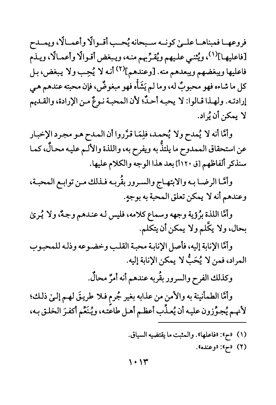 فروعها فمبناها على كونه سبحانه يُحب أقوالًا وأعمالًا، ويمدح [فاعليها] (¬١)، ويُثني عليهم ويُقرِّبهم منه، ويبغض أقوالًا وأعمالًا، ويذم فاعليها ويبغضهم ويبعدهم منه. [وعندهم] (¬٢) أنه لا يُحِب ولا يبغض، بل كل ما شاءه فهو محبوبٌ له، وما لم يَشَأْه فهو مبغوضٌ، فإن محبته عندهم هي إرادته. ولهذا قالوا: لا يحبه أحدٌ؛ لأن المحبة نوعٌ من الإرادة، والقديم لا يمكن أن يُراد.