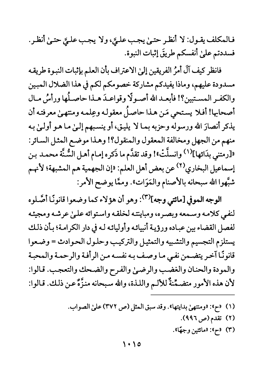 فانظر كيف آلَ أمرُ الفريقين إلى الاعتراف بأن العلم بإثبات النبوة طريقه مسدودة عليهم، وماذا يفيدكم مشاركة خصومكم لكم في هذا الضلال المبين والكفر المستبين؟! فأبعد الله أصولًا وقواعدَ هذا حاصلُها ورأسُ مال أصحابها! أفلا يستحي مَن هذا حاصلُ معقوله وعِلمه ومنتهى معرفته أن يذكر أنصارَ الله ورسوله وحزبه بما لا يليق، أو ينسبهم إلى ما هو أولى به منهم من الجهل ومخالفة المعقول والمنقول؟! وهذا موضع المثل السائر: «[رمتني بدَائها] (¬١) وانسلَّتْ»! وقد تقدَّم ما ذَكره إمام أهل السُّنَّة محمد بن إسماعيل البخاري (¬٢) عن بعض أهل العلم: «إن الجهمية هم المشبهة؛ لأنهم شبَّهوا الله سبحانه بالأصنام والمَوَات». وممَّا يوضح الأمر: