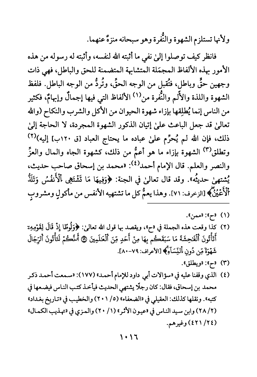 فانظر كيف توصلوا إلى نفي ما أثبته الله لنفسه، وأثبته له رسوله من هذه الأمور بهذه الألفاظ المجمَلة المتشابهة المتضمنة للحق والباطل، فهي ذات وجهين حقٍّ وباطلٍ، فتُقبل من الوجه الحقِّ، وتُردُّ من الوجه الباطل. فلفظ الشهوة واللذة والألم والنُّفرة من (¬١) الألفاظ التي فيها إجمالٌ وإبهامٌ، فكثير من الناس إنما يُطلِقها بإزاء شهوة الحيوان من الأكل والشرب والنكاح (والله تعالى قد جعل الباعث على إتيان الذكور الشهوة المجردة، لا الحاجة إلى ذلك، فإن الله لم يُحرِّم على عباده ما يحتاج العباد [ق ١٢٠ ب] إليه) (¬٢) وتطلق (¬٣) الشهوة بإزاء ما هو أعمُّ من ذلك، كشهوة الجاه والمال والعزِّ والنصر والعلم. قال الإمام أحمد (¬٤): «محمد بن إسحاق صاحب حديث، يُشتهى حديثُه». وقد قال تعالى في الجنة: {وَفِيهَا مَا تَشْتَهِي اِلْأَنفُسُ وَتَلَذُّ اُلْأَعْيُنُ} [الزخرف: ٧١]. وهذا يعمُّ كل ما تشتهيه الأنفس من مأكولٍ ومشروبٍ