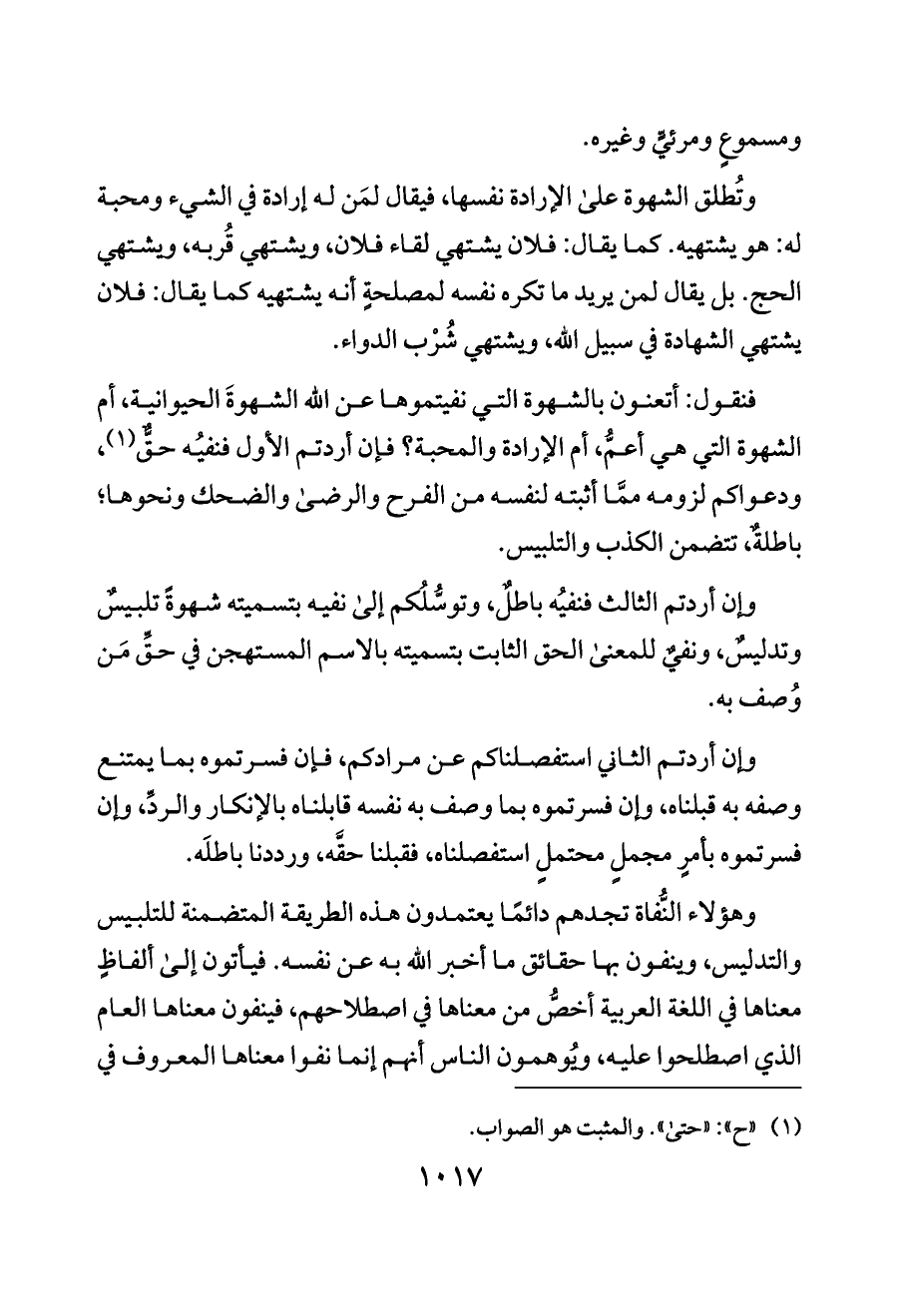 وإن أردتم الثالث فنفيُه باطلٌ، وتوسُّلُكم إلى نفيه بتسميته شهوةً تلبيسٌ وتدليسٌ، ونفيٌ للمعنى الحق الثابت بتسميته بالاسم المستهجن في حقِّ مَن وُصف به.