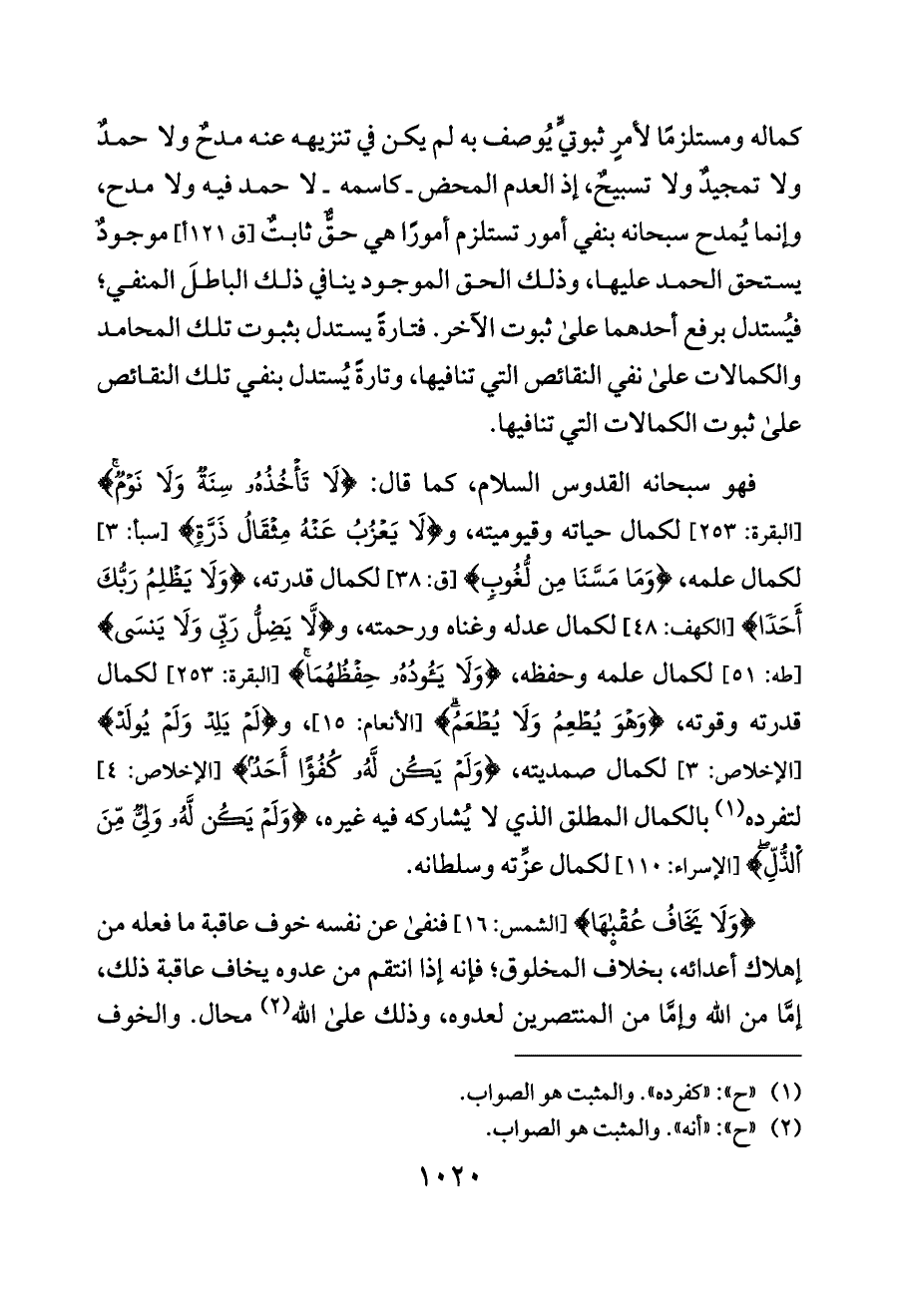 فهو سبحانه القدوس السلام، كما قال: {لَا تَأْخُذُهُ سِنَةٌ وَلَا نَوْمٌ} [البقرة: ٢٥٣] لكمال حياته وقيوميته، و {لَا يَعْزُبُ عَنْهُ مِثْقَالُ ذَرَّةٍ} [سبأ: ٣] لكمال علمه، {وَمَا مَسَّنَا مِن لُّغُوبٍ} [ق: ٣٨] لكمال قدرته، {وَلَا يَظْلِمُ رَبُّكَ أَحَدًا} [الكهف: ٤٨] لكمال عدله وغناه ورحمته، و {لَّا يَضِلُّ رَبِّي وَلَا يَنسَى} [طه: ٥١] لكمال علمه وحفظه، {وَلَا يَئُودُهُ حِفْظُهُمَا} [البقرة: ٢٥٣] لكمال قدرته وقوته، {وَهْوَ يُطْعِمُ وَلَا يُطْعَمُ} [الأنعام: ١٥]، و {لَمْ يَلِدْ وَلَمْ يُولَدْ} [الإخلاص: ٣] لكمال صمديته، {وَلَمْ يَكُن لَّهُ كُفُؤًا أَحَدٌ} [الإخلاص: ٤] لتفرده (¬١) بالكمال المطلق الذي لا يُشاركه فيه غيره، {وَلَمْ يَكُن لَّهُ وَلِيٌّ مِّنَ اَلذُّلِّ} [الإسراء: ١١٠] لكمال عزِّته وسلطانه.