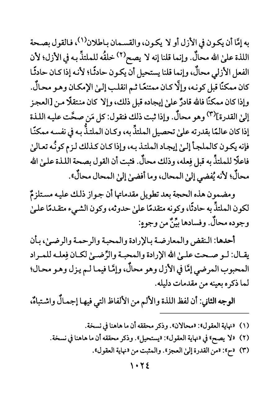 ومضمون هذه الحجة بعد تطويل مقدماتها أن جواز ذلك عليه مستلزمٌ لكون الملتذِّ به حادثًا، وكونه متقدمًا على حدوثه، وكون الشيء متقدمًا على وجوده محالٌ. وفسادها بيِّنٌ من وجوهٍ: