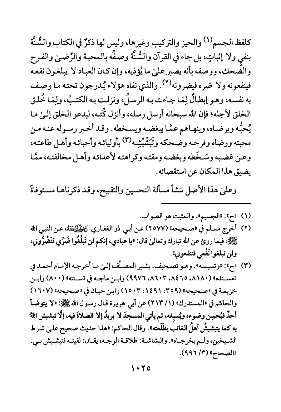 كلفظ الجسم (¬١) والحيز والتركيب وغيرها، وليس لها ذكرٌ في الكتاب والسُّنَّة بنفيٍ ولا إثباتٍ، بل جاء في القرآن والسُّنَّة وصفُه بالمحبة والرِّضى والفرح والضحك، ووصفه بأنه يصبر على ما يُؤذيه، وإن كان العباد لا يبلغون نفعه فينفعونه ولا ضره فيضرونه (¬٢). والذي نفاه هؤلاء يُدرجون تحته ما وصف به نفسه، وهو إبطالٌ لِمَا جاءت به الرسلُ، ونزلت به الكتبُ، ولِمَا خُلق الخلق لأجله؛ فإن الله سبحانه أرسل رسله، وأنزل كُتبه، ليدعو الخلق إلى ما يُحبُّه ويرضاه، وينهاهم عمَّا يبغضه ويسخطه. وقد أخبر رسوله عنه من محبته ورضاه وفرحه وضحكه وتَبَشْبُشِه (¬٣) بأوليائه وأحبائه وأهل طاعته، وعن غضبه وسَخَطه وبغضه ومقته وكراهته لأعدائه وأهل مخالفته، ممَّا يضيق هذا المكان عن استقصائه.