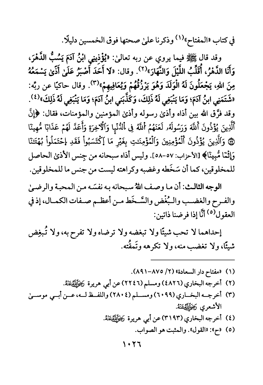 وقد قال - صلى الله عليه وسلم - فيما يروي عن ربه تعالى: «يُؤْذِينِي ابْنُ آدَمَ يَسُبُّ الدَّهْرَ، وَأَنَا الدَّهْرُ، أُقَلِّبُ اللَّيْلَ وَالنَّهَارَ» (¬٢). وقال: «لَا أَحَدَ أَصْبَرُ عَلَى أَذًى يَسْمَعُهُ مِنَ اللَّهِ، يَجْعَلُونَ لَهُ الْوَلَدَ وَهُوَ يَرْزُقُهُمْ وَيُعَافِيهِمْ» (¬٣). وقال حاكيًا عن ربِّه: «شَتَمَنِي ابنُ آدَمَ؛ وَمَا يَنْبَغِي لَهُ ذَلِكَ، وَكَذَّبَني ابنُ آدَمَ؛ وَمَا يَنْبَغِي لَهُ ذَلِكَ» (¬٤). وقد فرَّق الله بين أذاه وأذى رسوله وأذى المؤمنين والمؤمنات، فقال: {إِنَّ اَلَّذِينَ يُؤْذُونَ اَللَّهَ وَرَسُولَهُ لَعَنَهُمُ اُللَّهُ فِي اِلدُّنْيا وَاَلْآخِرَةِ وَأَعَدَّ لَهُمْ عَذَابًا مُّهِينًا (٥٧) وَاَلَّذِينَ يُؤْذُونَ اَلْمُؤْمِنِينَ وَاَلْمُؤْمِنَاتِ بِغَيْرِ مَا اَكْتَسَبُوا فَقَدِ اِحْتَمَلُوا بُهْتَانًا وَإِثْمًا مُّبِينًا} [الأحزاب: ٥٧ - ٥٨]. وليس أذاه سبحانه من جِنس الأذى الحاصل للمخلوقين، كما أن سَخَطه وغضبه وكراهته ليست من جنس ما للمخلوقين.