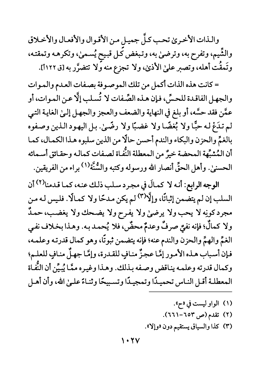 الوجه الرابع: أنه لا كمالَ في مجرد سلب ذلك عنه، كما قدمنا (¬٢) أن السلب إن لم يتضمن إثباتًا، وإلَّا (¬٣) لم يكن مدحًا ولا كمالًا. فليس له من مجرد كونِه لا يحب ولا يرضى ولا يفرح ولا يضحك ولا يغضب، حمدٌ ولا كمالٌ؛ فإنه نفيٌ صرفٌ وعدمٌ محضٌ، فلا يُحمد به. وهذا بخلاف نفي الغمِّ والهمِّ والحزن والندم عنه؛ فإنه يتضمن ثبوتًا، وهو كمال قدرته وعلمه، فإن أسباب هذه الأمور إمَّا عجزٌ منافٍ للقدرة، وإمَّا جهلٌ منافٍ للعلم؛ وكمال قدرته وعلمه يناقض وصفه بذلك. وهذا وغيره ممَّا يُبيِّن أن النُّفاة المعطلة أقل الناس تحميدًا وتمجيدًا وتسبيحًا وثناءً على الله، وأن أهل