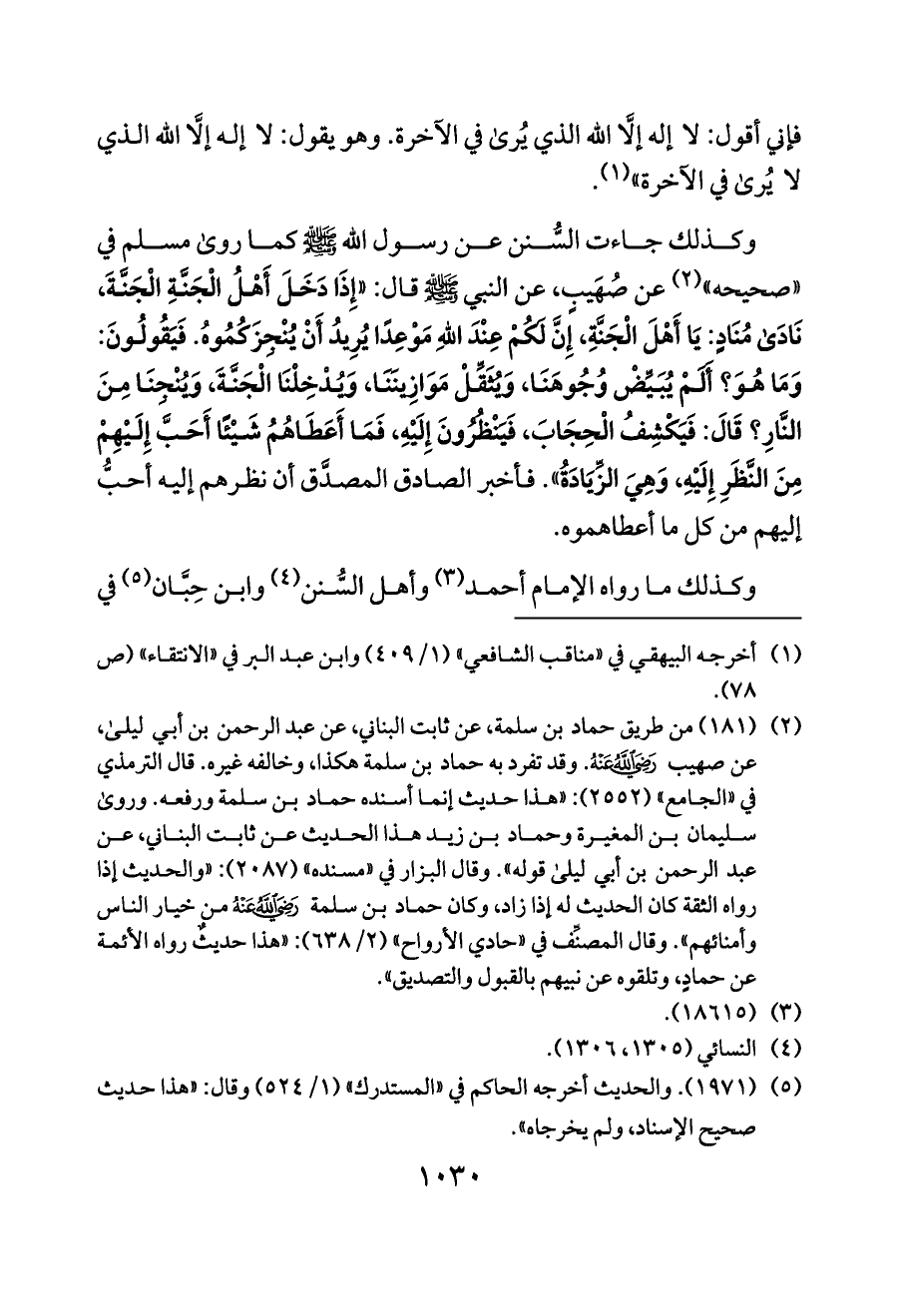 وكذلك جاءت السُّنن عن رسول الله - صلى الله عليه وسلم - كما روى مسلم في «صحيحه» (¬٢) عن صُهَيبٍ، عن النبي - صلى الله عليه وسلم - قال: «إِذَا دَخَلَ أَهْلُ الْجَنَّةِ الْجَنَّةَ، نَادَى مُنَادٍ: يَا أَهْلَ الْجَنَّةِ، إِنَّ لَكُمْ عِنْدَ اللَّهِ مَوْعِدًا يُرِيدُ أَنْ يُنْجِزَكُمُوهُ. فَيَقُولُونَ: وَمَا هُوَ؟ أَلَمْ يُبَيِّضْ وُجُوهَنَا، وَيُثَقِّلْ مَوَازِينَنَا، وَيُدْخِلْنَا الْجَنَّةَ، وَيُنْجِنَا مِنَ النَّارِ؟ قَالَ: فَيَكْشِفُ الْحِجَابَ، فَيَنْظُرُونَ إِلَيْهِ، فَمَا أَعَطَاهُمُ شَيْئًا أَحَبَّ إِلَيْهِمْ مِنَ النَّظَرِ إِلَيْهِ، وَهِيَ الزِّيَادَةُ». فأخبر الصادق المصدَّق أن نظرهم إليه أحبُّ إليهم من كل ما أعطاهموه.