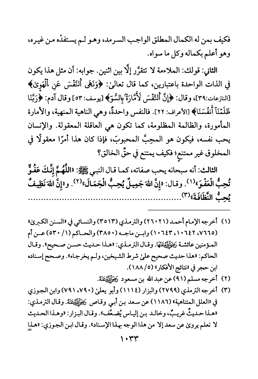 الثاني: قولك: الملاءمة لا تتقرَّر إلَّا بين اثنين. جوابه: أن مثل هذا يكون في الذات الواحدة باعتبارين، كما قال تعالى: {وَنَهَى اَلنَّفْسَ عَنِ اِلْهَوى} [النازعات:٣٩]، وقال: {إِنَّ اَلنَّفْسَ لَأَمَّارَةٌ بِالسُّو} [يوسف: ٥٣] وقال آدم: {رَبَّنَا ظَلَمْنَا أَنفُسَنَا} [الأعراف: ٢٢]. فالنفس واحدةٌ، وهي الناهية المنهية، والأمارة المأمورة، والظالمة المظلومة، كما تكون هي العاقلة المعقولة. والإنسان يحب نفسه، فيكون هو المحِبَّ المحبوبَ، فإذا كان هذا أمرًا معقولًا في المخلوق غير ممتنعٍ؛ فكيف يمتنع في حقِّ الخالق؟