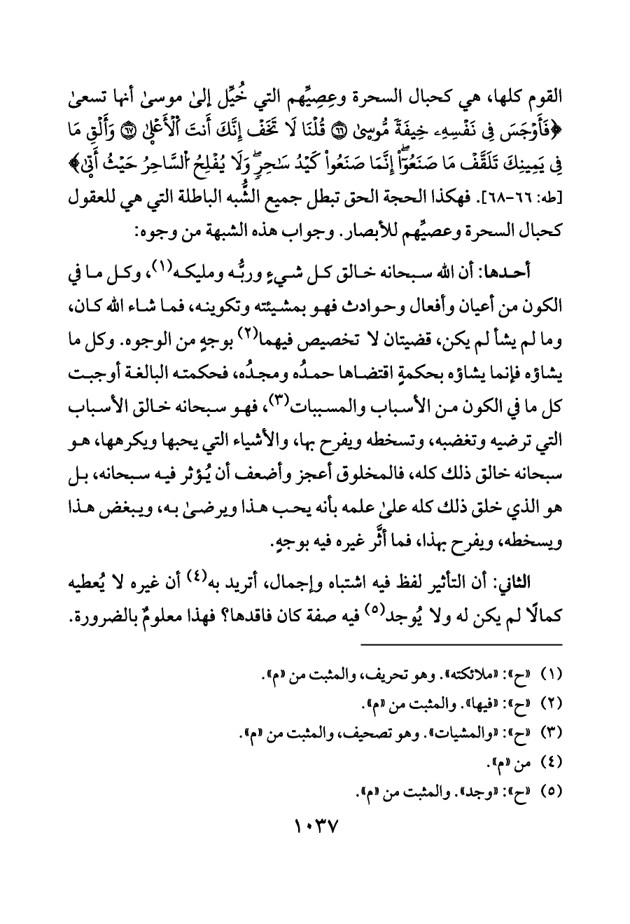 القوم كلها، هي كحبال السحرة وعِصِيِّهم التي خُيِّل إلى موسى أنها تسعى {فَأَوْجَسَ فِي نَفْسِهِ خِيفَةً مُّوسى (٦٦) قُلْنَا لَا تَخَفْ إِنَّكَ أَنتَ اَلْأَعْلى (٦٧) وَأَلْقِ مَا فِي يَمِينِكَ تَلَقَّفْ مَا صَنَعُوا إِنَّمَا صَنَعُوا كَيْدُ سَاحِرٍ وَلَا يُفْلِحُ اُلسَّاحِرُ حَيْثُ أَتى} [طه: ٦٦ - ٦٨]. فهكذا الحجة الحق تبطل جميع الشُّبه الباطلة التي هي للعقول كحبال السحرة وعصيِّهم للأبصار. وجواب هذه الشبهة من وجوه: