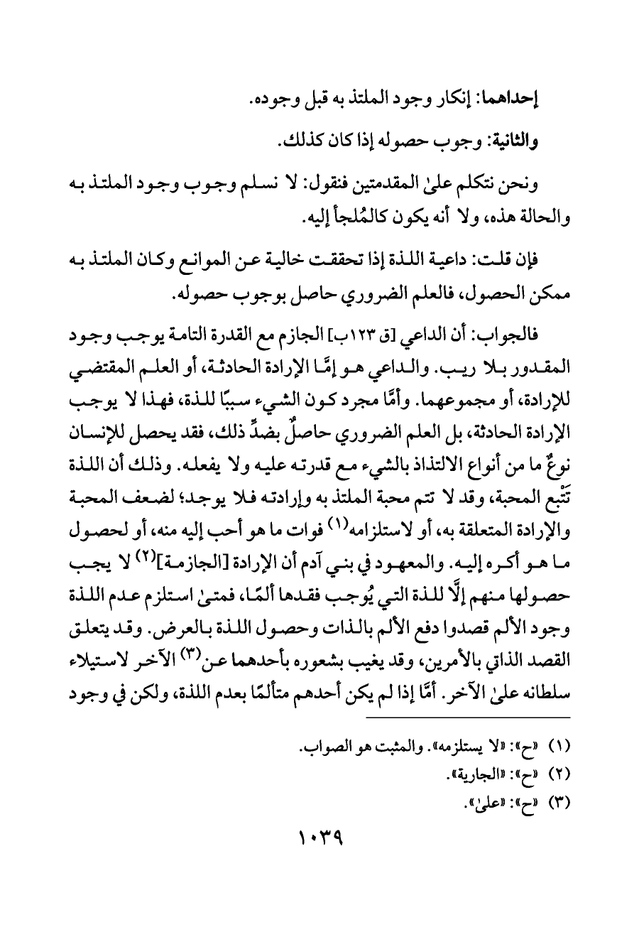 فالجواب: أن الداعي [ق ١٢٣ ب] الجازم مع القدرة التامة يوجب وجود المقدور بلا ريب. والداعي هو إمَّا الإرادة الحادثة، أو العلم المقتضي للإرادة، أو مجموعهما. وأمَّا مجرد كون الشيء سببًا للذة، فهذا لا يوجب الإرادة الحادثة، بل العلم الضروري حاصلٌ بضدِّ ذلك، فقد يحصل للإنسان نوعٌ ما من أنواع الالتذاذ بالشيء مع قدرته عليه ولا يفعله. وذلك أن اللذة تَتْبع المحبة، وقد لا تتم محبة الملتذ به وإرادته فلا يوجد؛ لضعف المحبة والإرادة المتعلقة به، أو لاستلزامه (¬١) فوات ما هو أحب إليه منه، أو لحصول ما هو أكره إليه. والمعهود في بني آدم أن الإرادة [الجازمة] (¬٢) لا يجب حصولها منهم إلَّا للذة التي يُوجب فقدها ألمًا، فمتى استلزم عدم اللذة وجود الألم قصدوا دفع الألم بالذات وحصول اللذة بالعرض. وقد يتعلق القصد الذاتي بالأمرين، وقد يغيب بشعوره بأحدهما عن (¬٣) الآخر لاستيلاء سلطانه على الآخر. أمَّا إذا لم يكن أحدهم متألمًا بعدم اللذة، ولكن في وجود
