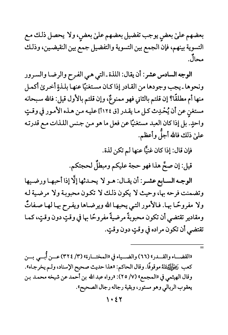 الوجه السادس عشر: أن يقال: اللذة ـ التي هي الفرح والرضا والسرور ونحوها ـ يجب وجودها من القادر إذا كان مستغنيًا عنها بلذةٍ أخرى أكمل منها أم مطلقًا؟ إن قلتم بالثاني فهو ممنوعٌ، وإن قلتم بالأول قيل: فالله سبحانه مستغنٍ عن أن يُحْدِث كل ما يقدر [ق ١٢٤ أ] عليه من هذه الأمور في وقتٍ واحدٍ. بل إذا كان العبد مستغنيًا عن فعل ما هو من جنس اللذات مع قدرته على ذلك فالله أجلُّ وأعظم.