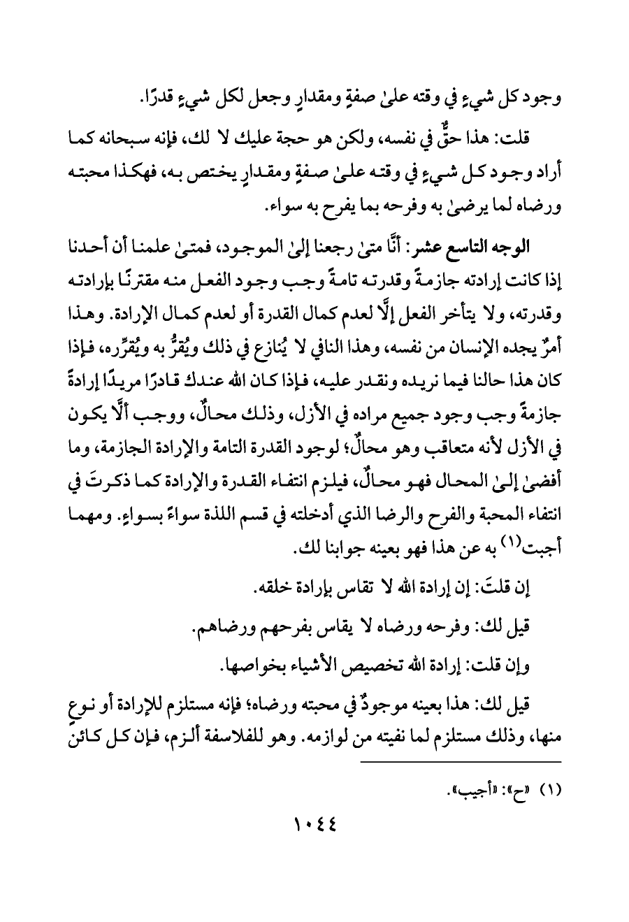 الوجه التاسع عشر: أنَّا متى رجعنا إلى الموجود، فمتى علمنا أن أحدنا إذا كانت إرادته جازمةً وقدرته تامةً وجب وجود الفعل منه مقترنًا بإرادته وقدرته، ولا يتأخر الفعل إلَّا لعدم كمال القدرة أو لعدم كمال الإرادة. وهذا أمرٌ يجده الإنسان من نفسه، وهذا النافي لا يُنازع في ذلك ويُقرُّ به ويُقرِّره، فإذا كان هذا حالنا فيما نريده ونقدر عليه، فإذا كان الله عندك قادرًا مريدًا إرادةً جازمةً وجب وجود جميع مراده في الأزل، وذلك محالٌ، ووجب ألَّا يكون في الأزل لأنه متعاقب وهو محالٌ؛ لوجود القدرة التامة والإرادة الجازمة، وما أفضى إلى المحال فهو محالٌ، فيلزم انتفاء القدرة والإرادة كما ذكرتَ في انتفاء المحبة والفرح والرضا الذي أدخلته في قسم اللذة سواءً بسواءٍ. ومهما أجبت (¬١) به عن هذا فهو بعينه جوابنا لك.