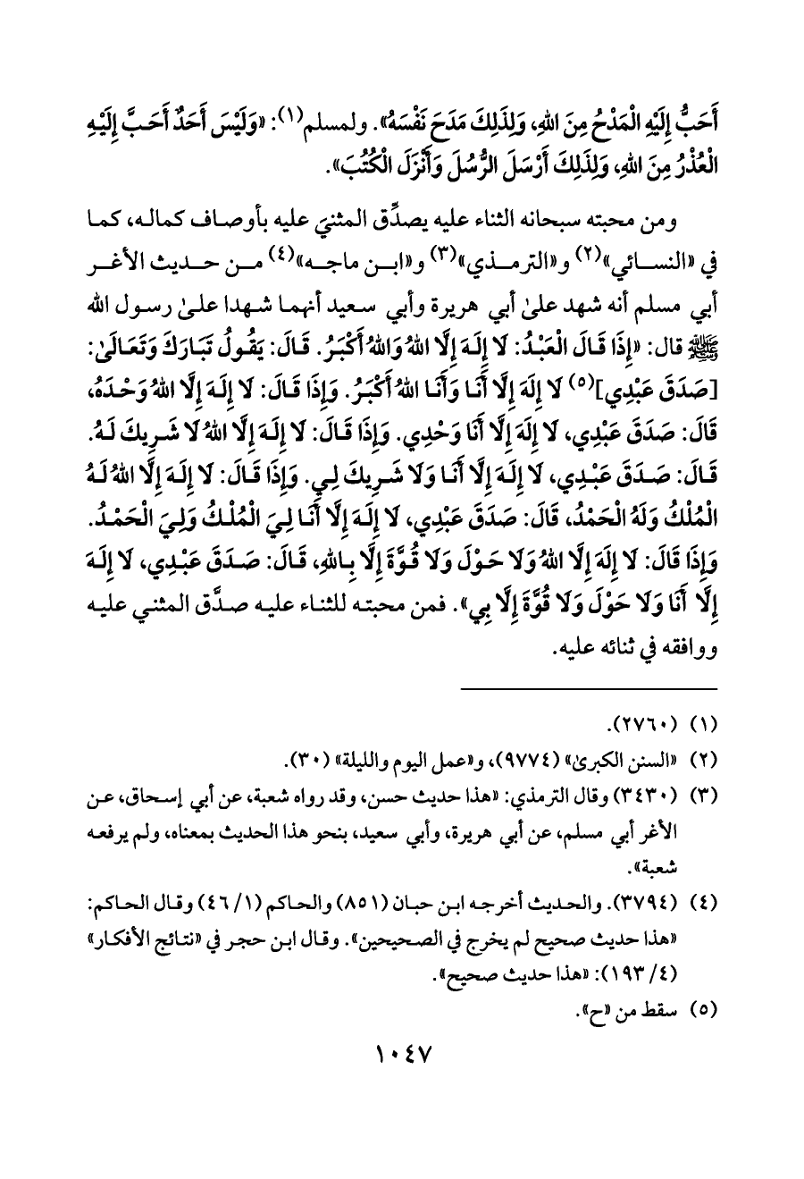 ومن محبته سبحانه الثناء عليه يصدِّق المثنيَ عليه بأوصاف كماله، كما في «النسائي» (¬٢) و «الترمذي» (¬٣) و «ابن ماجه» (¬٤) من حديث الأغر أبي مسلم أنه شهد على أبي هريرة وأبي سعيد أنهما شهدا على رسول الله - صلى الله عليه وسلم - قال: «إِذَا قَالَ الْعَبْدُ: لَا إِلَهَ إِلَّا اللَّهُ وَاللَّهُ أَكْبَرُ. قَالَ: يَقُولُ تَبَارَكَ وَتَعَالَى: [صَدَقَ عَبْدِي] (¬٥) لَا إِلَهَ إِلَّا أَنَا وَأَنَا اللهُ أَكْبَرُ. وَإِذَا قَالَ: لَا إِلَهَ إِلَّا اللَّهُ وَحْدَهُ، قَالَ: صَدَقَ عَبْدِي، لَا إِلَهَ إِلَّا أَنَا وَحْدِي. وَإِذَا قَالَ: لَا إِلَهَ إِلَّا اللَّهُ لَا شَرِيكَ لَهُ. قَالَ: صَدَقَ عَبْدِي، لَا إِلَهَ إِلَّا أَنَا وَلَا شَرِيكَ لِي. وَإِذَا قَالَ: لَا إِلَهَ إِلَّا اللَّهُ لَهُ الْمُلْكُ وَلَهُ الْحَمْدُ، قَالَ: صَدَقَ عَبْدِي، لَا إِلَهَ إِلَّا أَنَا لِيَ الْمُلْكُ وَلِيَ الْحَمْدُ. وَإِذَا قَالَ: لَا إِلَهَ إِلَّا اللَّهُ وَلَا حَوْلَ وَلَا قُوَّةَ إِلَّا بِاللَّهِ، قَالَ: صَدَقَ عَبْدِي، لَا إِلَهَ إِلَّا أَنَا وَلَا حَوْلَ وَلَا قُوَّةَ إِلَّا بِي». فمن محبته للثناء عليه صدَّق المثني عليه ووافقه في ثنائه عليه.