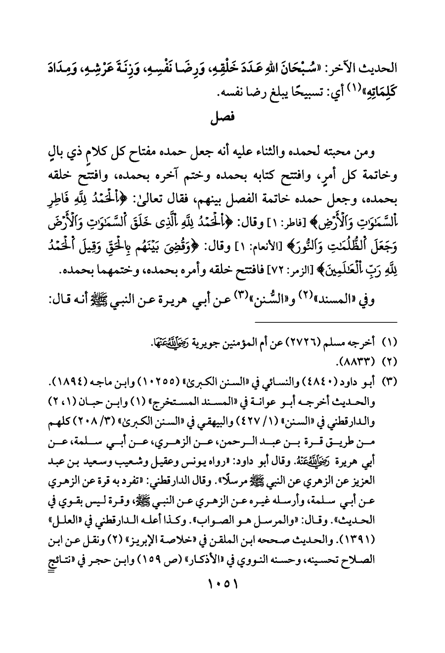 ومن محبته لحمده والثناء عليه أنه جعل حمده مفتاح كل كلامٍ ذي بالٍ وخاتمة كل أمرٍ، وافتتح كتابه بحمده وختم آخره بحمده، وافتتح خلقه بحمده، وجعل حمده خاتمة الفصل بينهم، فقال تعالى: {اِلْحَمْدُ لِلَّهِ فَاطِرِ اِلسَّمَاوَاتِ وَاَلْأَرْضِ} [فاطر: ١] وقال: {اِلْحَمْدُ لِلَّهِ اِلَّذِي خَلَقَ اَلسَّمَاوَاتِ وَاَلْأَرْضَ وَجَعَلَ اَلظُّلُمَاتِ وَاَلنُّورَ} [الأنعام: ١] وقال: {وَقُضِيَ بَيْنَهُم بِالْحَقِّ وَقِيلَ اَلْحَمْدُ لِلَّهِ رَبِّ اِلْعَالَمِينَ} [الزمر: ٧٢] فافتتح خلقه وأمره بحمده، وختمهما بحمده.