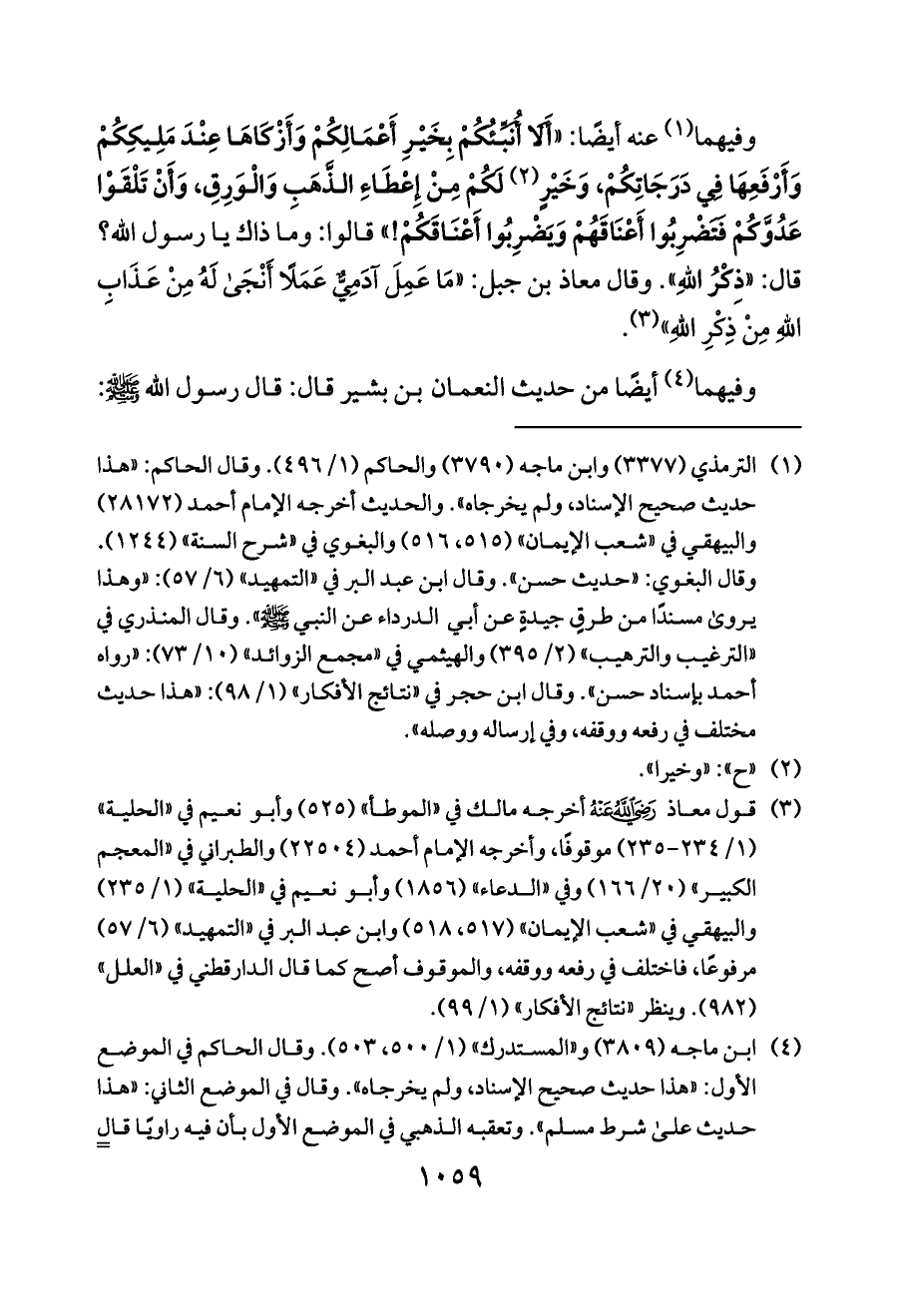 وفيهما (¬١) عنه أيضًا: «أَلَا أُنَبِّئُكُمْ بِخَيْرِ أَعْمَالِكُمْ وَأَزْكَاهَا عِنْدَ مَلِيكِكُمْ وَأَرْفَعِهَا فِي دَرَجَاتِكُمْ، وَخَيْرٍ (¬٢) لَكُمْ مِنْ إِعْطَاءِ الذَّهَبِ وَالْوَرِقِ، وَأَنْ تَلْقَوْا عَدُوَّكُمْ فَتَضْرِبُوا أَعْنَاقَهُمْ وَيَضْرِبُوا أَعْنَاقَكُمْ!» قالوا: وما ذاك يا رسول الله؟ قال: «ذِكْرُ اللهِ». وقال معاذ بن جبل: «مَا عَمِلَ آدَمِيٌّ عَمَلًا أَنْجَى لَهُ مِنْ عَذَابِ اللَّهِ مِنْ ذِكْرِ اللَّهِ» (¬٣).