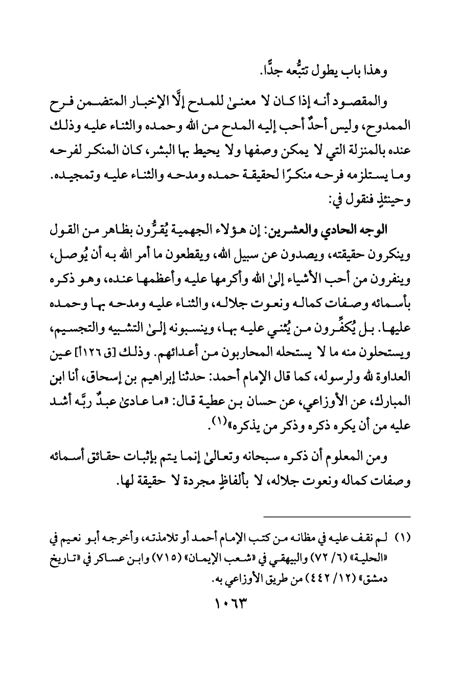 الوجه الحادي والعشرين: إن هؤلاء الجهمية يُقرُّون بظاهر من القول وينكرون حقيقته، ويصدون عن سبيل الله، ويقطعون ما أمر الله به أن يُوصل، وينفرون من أحب الأشياء إلى الله وأكرمها عليه وأعظمها عنده، وهو ذكره بأسمائه وصفات كماله ونعوت جلاله، والثناء عليه ومدحه بها وحمده عليها. بل يُكفِّرون من يُثني عليه بها، وينسبونه إلى التشبيه والتجسيم، ويستحلون منه ما لا يستحله المحاربون من أعدائهم. وذلك [ق ١٢٦ أ] عين العداوة لله ولرسوله، كما قال الإمام أحمد: حدثنا إبراهيم بن إسحاق، أنا ابن المبارك، عن الأوزاعي، عن حسان بن عطية قال: «ما عادى عبدٌ ربَّه أشد عليه من أن يكره ذكره وذكر من يذكره» (¬١).