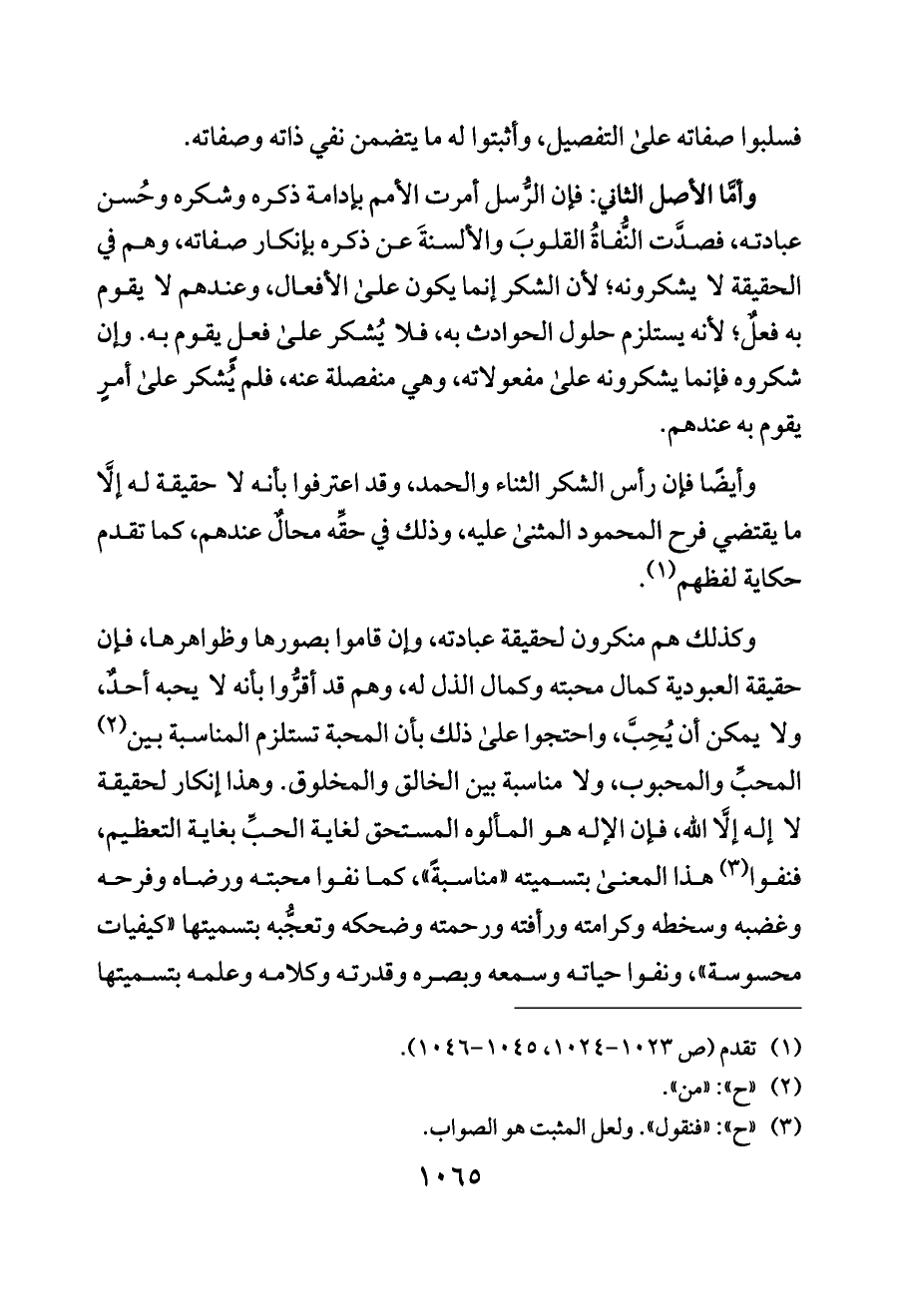 وأمَّا الأصل الثاني: فإن الرُّسل أمرت الأمم بإدامة ذكره وشكره وحُسن عبادته، فصدَّت النُّفاةُ القلوبَ والألسنةَ عن ذكره بإنكار صفاته، وهم في الحقيقة لا يشكرونه؛ لأن الشكر إنما يكون على الأفعال، وعندهم لا يقوم به فعلٌ؛ لأنه يستلزم حلول الحوادث به، فلا يُشكر على فعلٍ يقوم به. وإن شكروه فإنما يشكرونه على مفعولاته، وهي منفصلة عنه، فلم يُشكر على أمرٍ يقوم به عندهم.