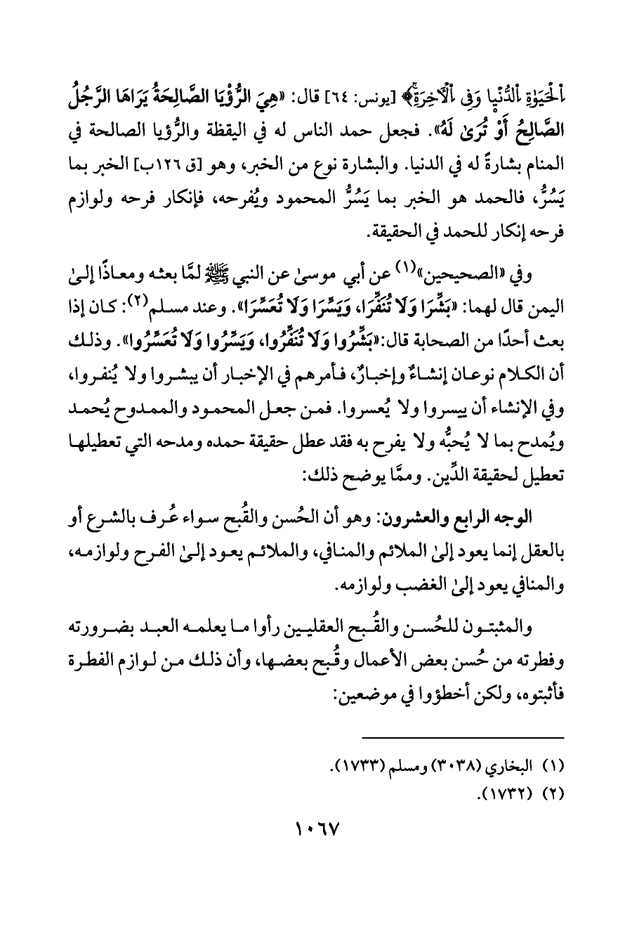 وفي «الصحيحين» (¬١) عن أبي موسى عن النبي - صلى الله عليه وسلم - لمَّا بعثه ومعاذًا إلى اليمن قال لهما: «بَشِّرَا وَلَا تُنَفِّرَا، وَيَسِّرَا وَلَا تُعَسِّرَا». وعند مسلم (¬٢): كان إذا بعث أحدًا من الصحابة قال: «بَشِّرُوا وَلَا تُنَفِّرُوا، وَيَسِّرُوا وَلَا تُعَسِّرُوا». وذلك أن الكلام نوعان إنشاءٌ وإخبارٌ، فأمرهم في الإخبار أن يبشروا ولا يُنفروا، وفي الإنشاء أن ييسروا ولا يُعسروا. فمن جعل المحمود والممدوح يُحمد ويُمدح بما لا يُحبُّه ولا يفرح به فقد عطل حقيقة حمده ومدحه التي تعطيلها تعطيل لحقيقة الدِّين. وممَّا يوضح ذلك: