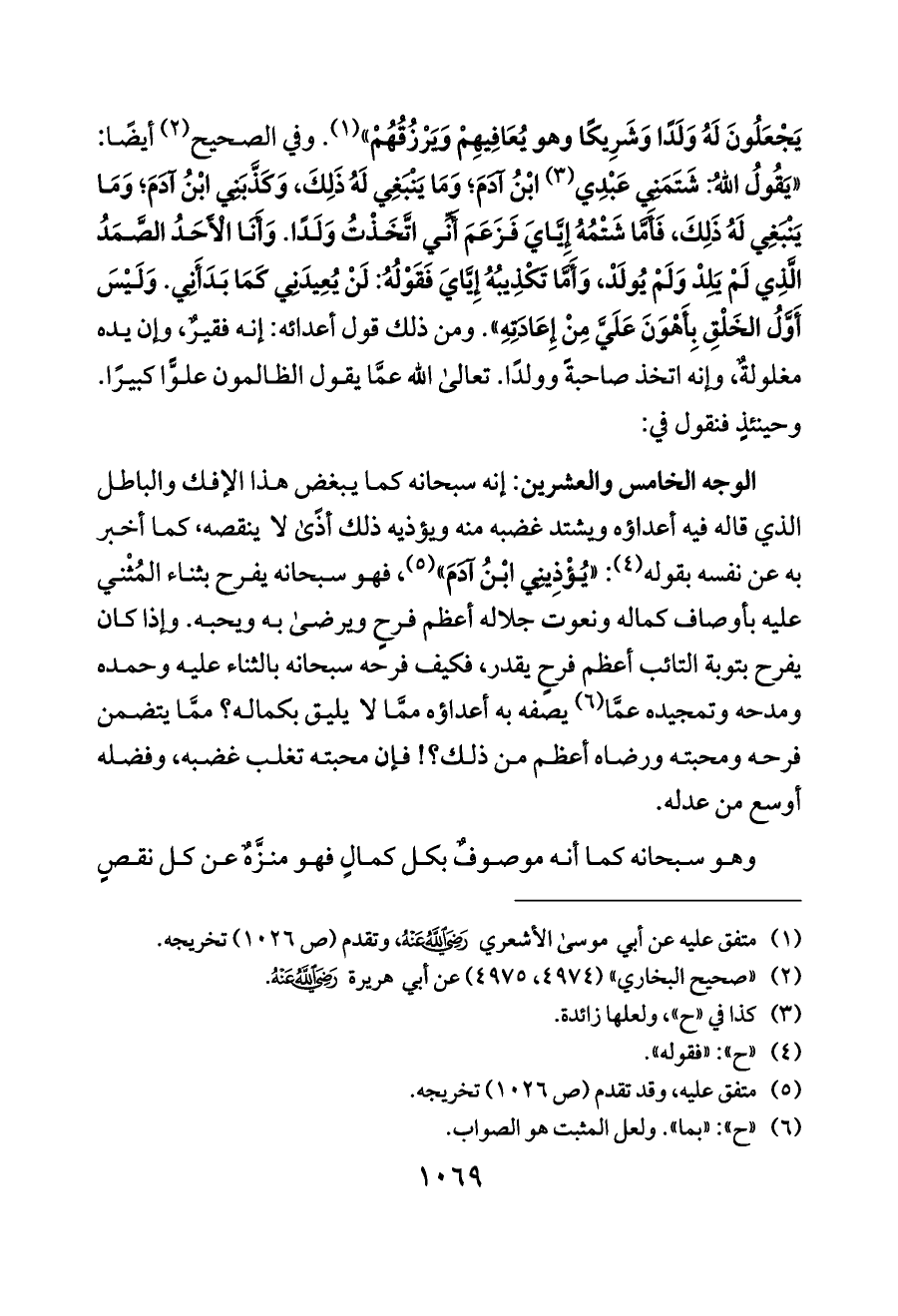 يَجْعَلُونَ لَهُ وَلَدًا وَشَرِيكًا وهو يُعَافِيهِمْ وَيَرْزُقُهُمْ» (¬١). وفي الصحيح (¬٢) أيضًا: «يَقُولُ اللهُ: شَتَمَنِي عَبْدِي (¬٣) ابْنُ آدَمَ؛ وَمَا يَنْبَغِي لَهُ ذَلِكَ، وَكَذَّبَنِي ابْنُ آدَمَ؛ وَمَا يَنْبَغِي لَهُ ذَلِكَ، فَأَمَّا شَتْمُهُ إِيَّايَ فَزَعَمَ أَنِّي اتَّخَذْتُ وَلَدًا. وَأَنَا الْأَحَدُ الصَّمَدُ الَّذِي لَمْ يَلِدْ وَلَمْ يُولَدْ، وَأَمَّا تَكْذِيبُهُ إِيَّايَ فَقَوْلُهُ: لَنْ يُعِيدَنِي كَمَا بَدَأَنِي. وَلَيْسَ أَوَّلُ الخَلْقِ بِأَهْوَنَ عَلَيَّ مِنْ إِعَادَتِهِ». ومن ذلك قول أعدائه: إنه فقيرٌ، وإن يده مغلولةٌ، وإنه اتخذ صاحبةً وولدًا. تعالى الله عمَّا يقول الظالمون علوًّا كبيرًا. وحينئذٍ فنقول في: